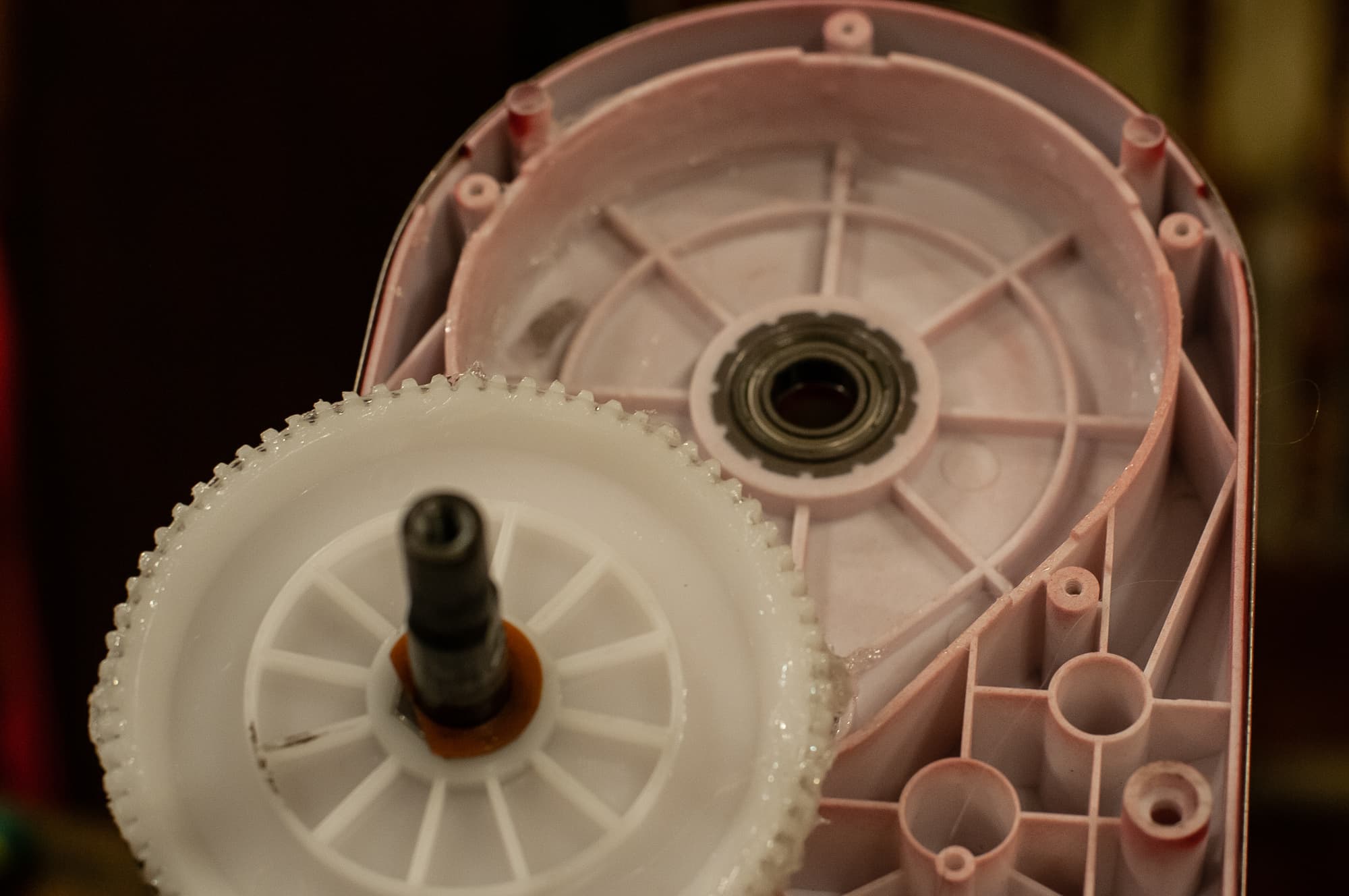 Под крышкой оказывается еще одна пара из металлической и полиамидную шестерни с обилием консистентной смазки, а вот с обратной стороны шестерни мы видим отколотый кусочек пластиковой шайбы.
