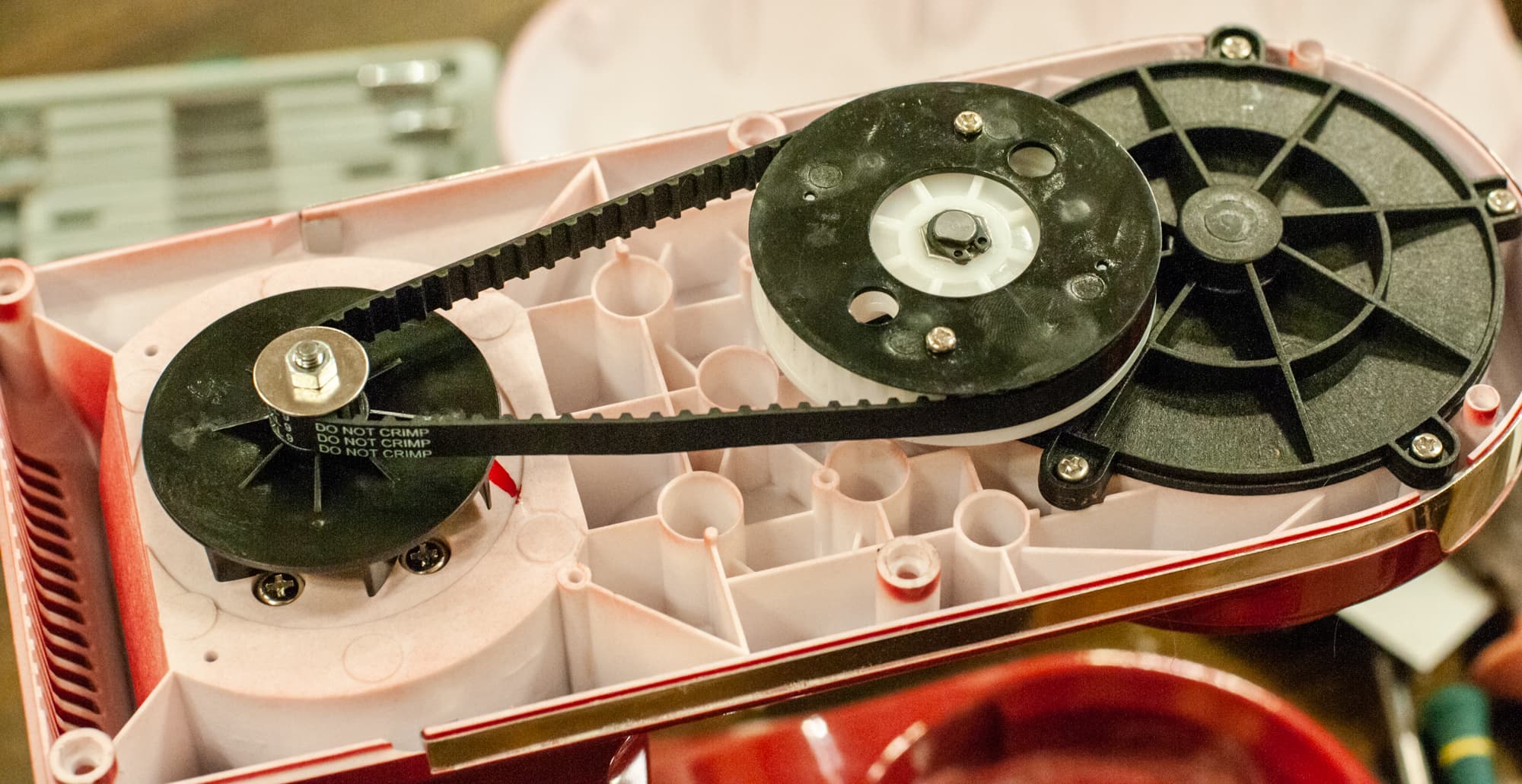 Снимаем верхнюю пластиковую крышку, держащуюся на 6 саморезах. Видим вал мотора, качественный зубчатый ремень, еще одну полиамидную шестерню и крышку редуктора. Неприятный хруст идет из-под нее.