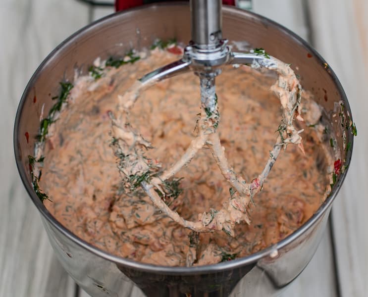 С помощью миксера сделали начинку из куриного фарша, мелко дробленого лука, специй и укропа. Вторую начинку — с болгарским перцем — вымешивали тоже миксером. Для нее мы соединили творожный сыр, нарезанный болгарский перец, натертый овечий сыр, укроп, черный перец и специи и вымешивали их с помощью перемешивающей насадки на 5-й скорости пару минут.
