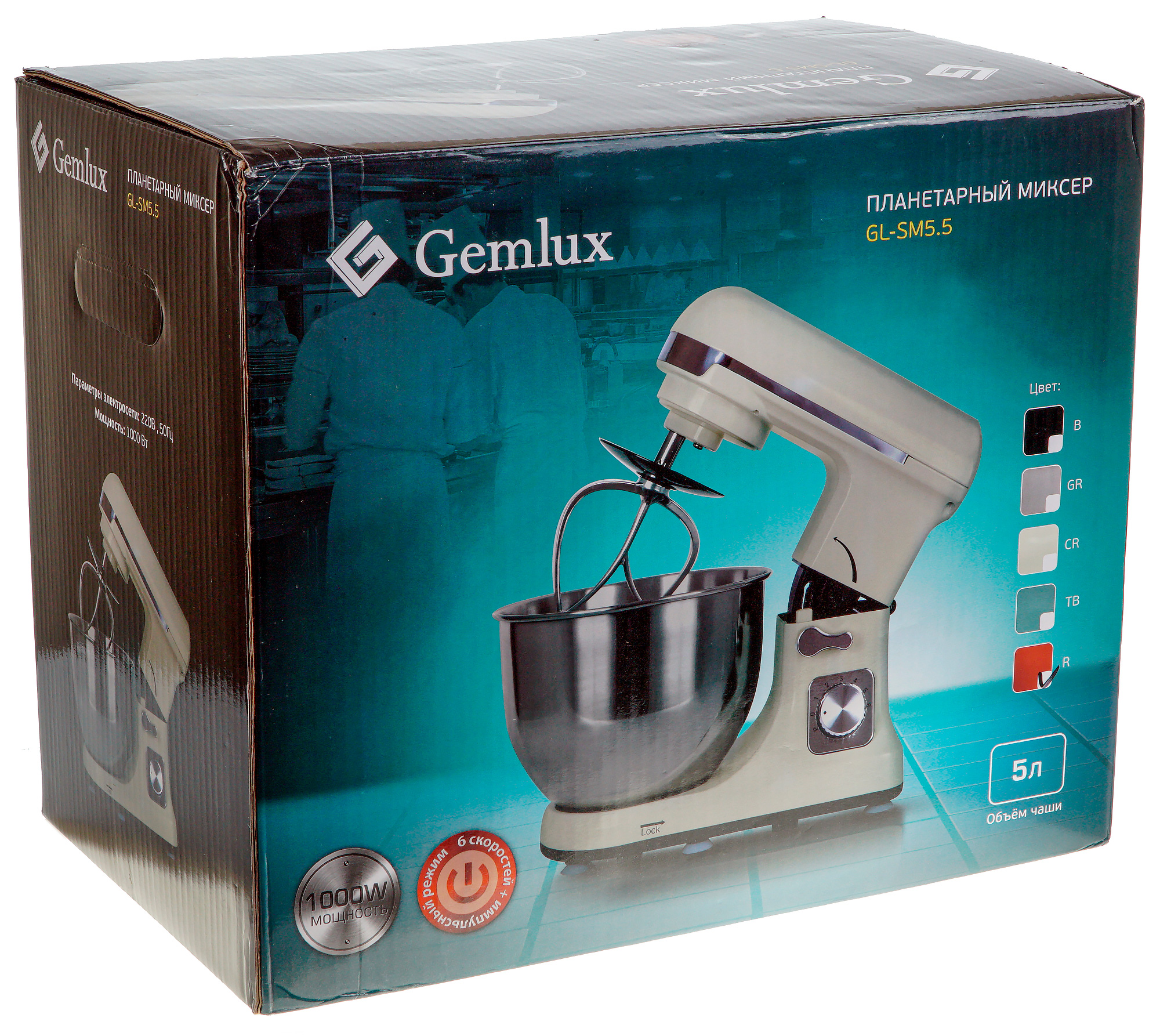 Планетарный миксер Gemlux GL-SM5.5 прибыл на тестирование в большой картонной коробке. Коробка черно-синего цвета снабжена текстом с техническими характеристиками модели, логотипом производителя и проиллюстрирована цветными фотографиями прибора в разных ракурсах. Ручкой для переноски упаковка не оборудована.