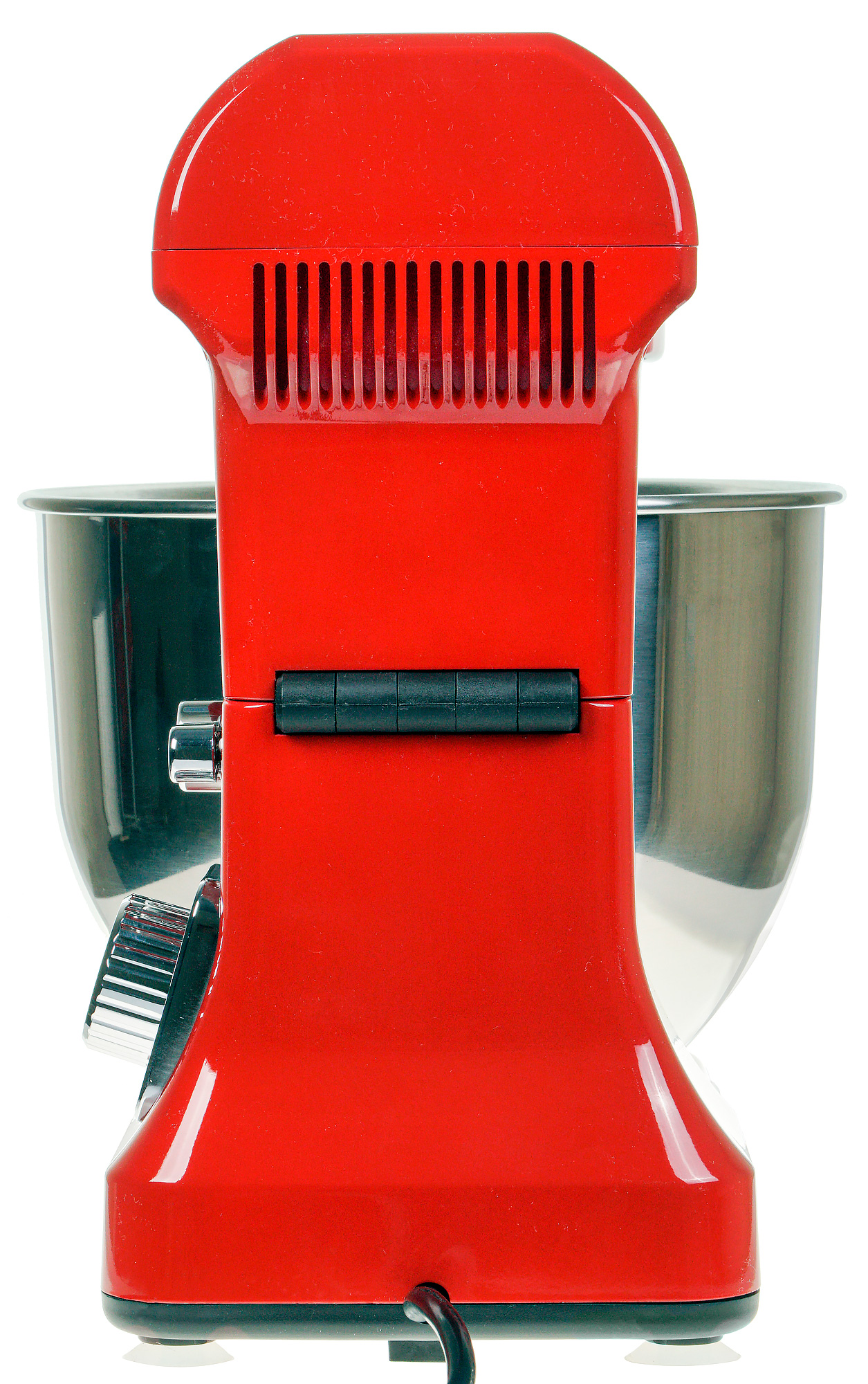 Нержавеющая чаша на 5,5 л встает в специальное нижнее отверстие базы и надежно в нем блокируется поворотом против часовой стрелки. Управляющая откидная головка поднимается вверх при подъеме рычага, который находится на боковой панели над ручкой управления. В откинутом положении она может блокироваться с помощью этого же рычага.