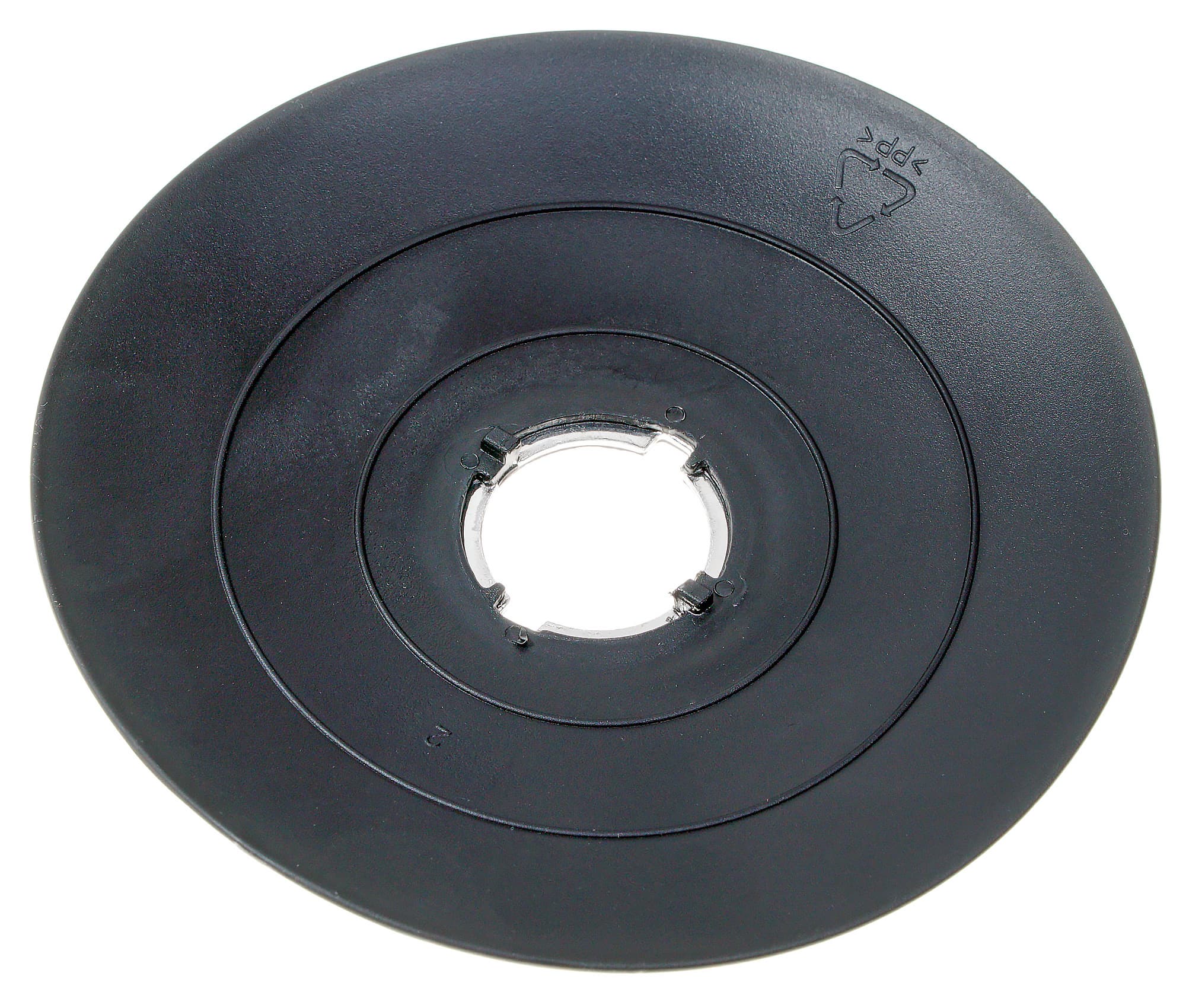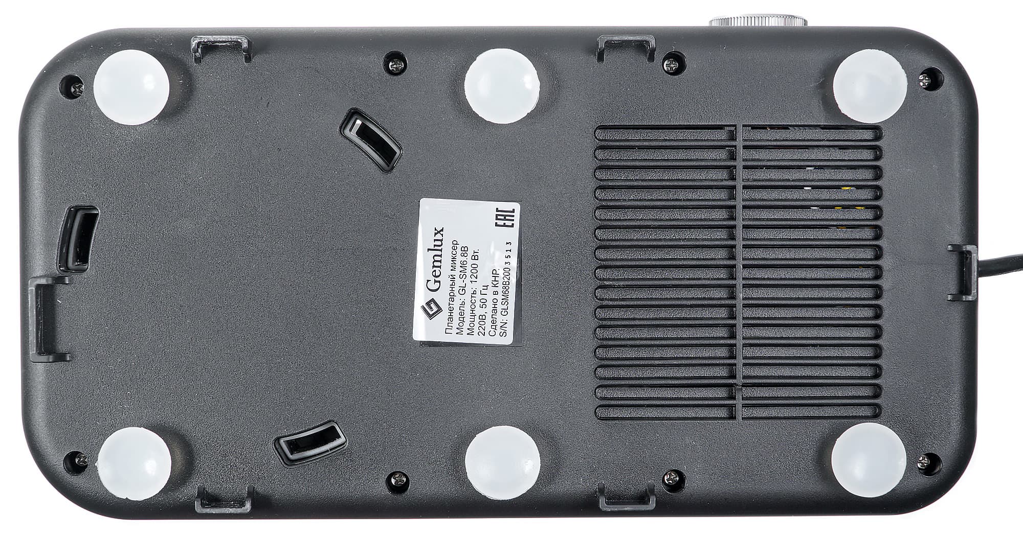 Нижняя часть корпуса оснащена шестью ножками с присосками. Диаметр присосок — 2,6 см, они достаточно крепко удерживают прибор на месте. В то же время, оторвать прибор от поверхности стола не очень сложно, т. е. при перестановке и других манипуляциях с прибором не возникает затруднений. Помимо ножек, прибор опирается на шесть пластиковых упоров, расположенных у границы нижней и боковой поверхностей корпуса. Также на дне мы видим наклейку с технической информацией о миксере и вентиляционные отверстия, предназначенные для отвода от мотора нагретого воздуха.