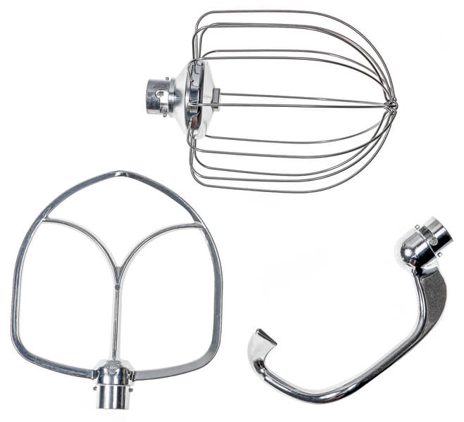 Набор насадок, также как и их форма, традиционны: венчик, лопатка и крюк для замеса плотного теста. Насадки цельнометаллические, крюк и лопатка (или битер, как называет ее производитель) изготовлены из силумина, венчик — силуминовое основание и стальные прутья.