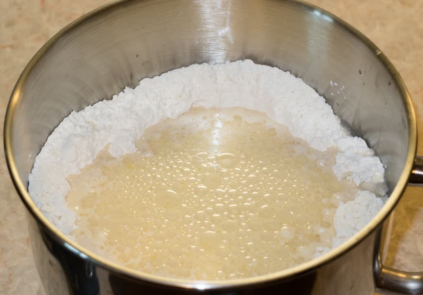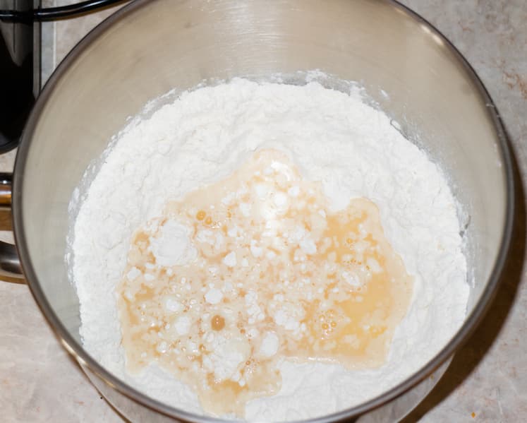 В отдельной чаше растворили в 250 мл молока 35 г свежих дрожжей, добавили пару яиц, три столовых ложки сахара, пару чайных ложек соли и долили теплой воды до объема в 850 мл. Все хорошенько перемешали и вылили в муку. Туда же отправили три столовых ложки растительного масла.