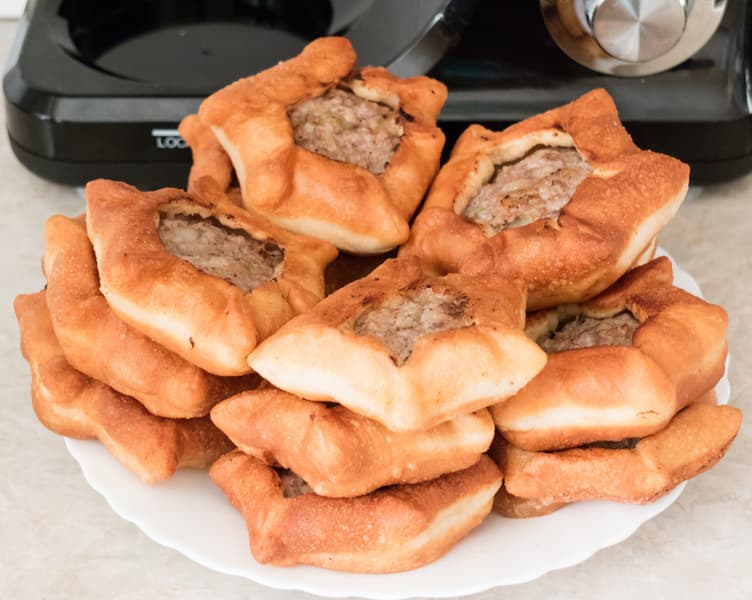 Ну а далее ничего нового: брали комочек теста, раскатывали (тесто не такое тугое, как пельменное, но все же лепить лепешку вручную было утомительно), клали в центр начинку и защипывали края. Дали будущим беляшам немного расстояться, а затем обжарили в большом количестве масла.