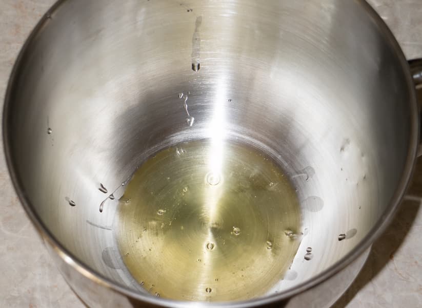 Цель эксперимента — определить минимальный объем продуктов, который может быть успешно взбит в шести литровой чаше миксера. Поэтому начали мы с трех белков. На дне объемной чаши белки смотрелись, прямо скажем, несколько странно. Закрепили венчик и, не добавляя ничего, начали работу.