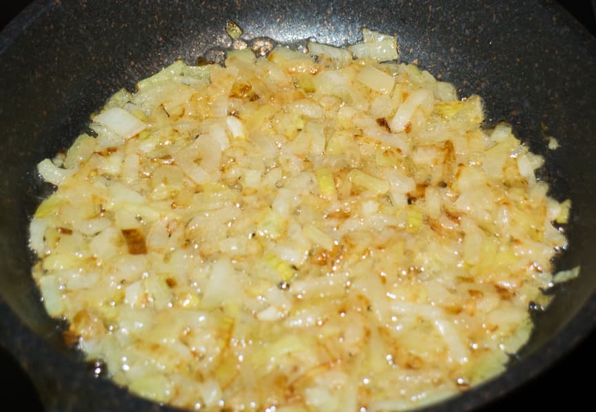 Ближе ко времени окончания варки поджарили на смеси растительного и сливочного масел лук и мелко нарезанные шампиньоны.