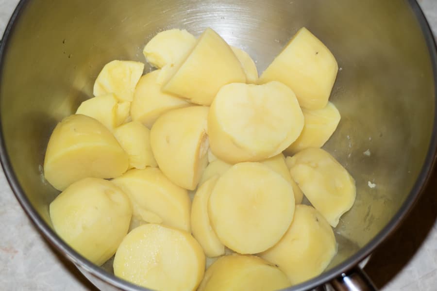 Отварили 1,2 кг очищенного картофеля, слили воду и поместили кусочки в чашу миксера.