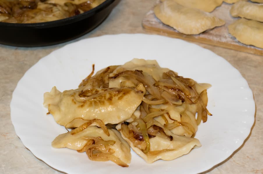 Вареников получилось много, очень много. Больше половины спрятали в морозилку, остатки отварили и слегка поджарили с луком.