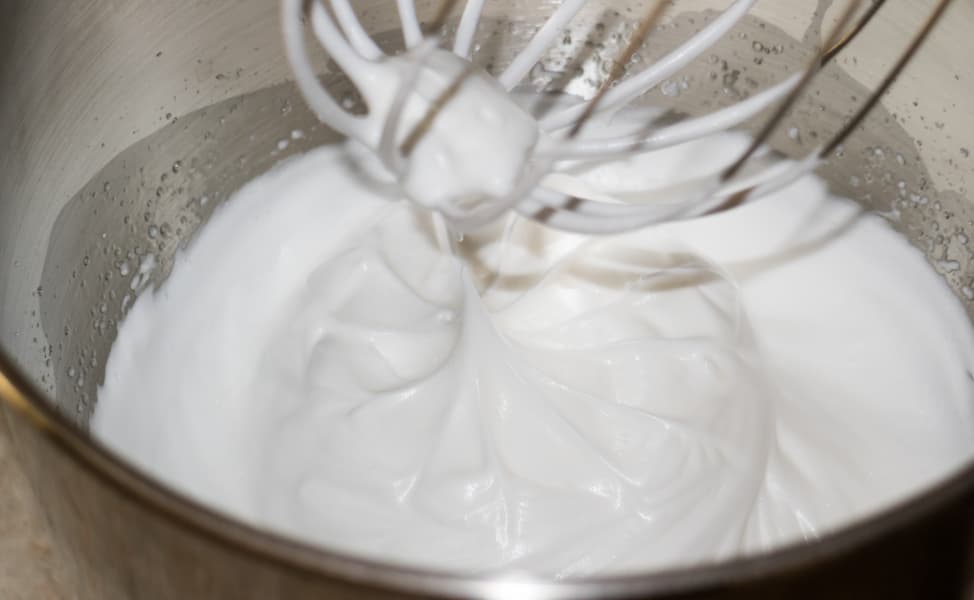 Плавно, но быстро перевели миксер в максимальный скоростной режим. Уже через минуту белки превратились в пышную белую пену. На второй минуте взбивания, не останавливая процесс, добавили три столовых ложки сахара. Через три минуты белки достигли стадии твердых пик.