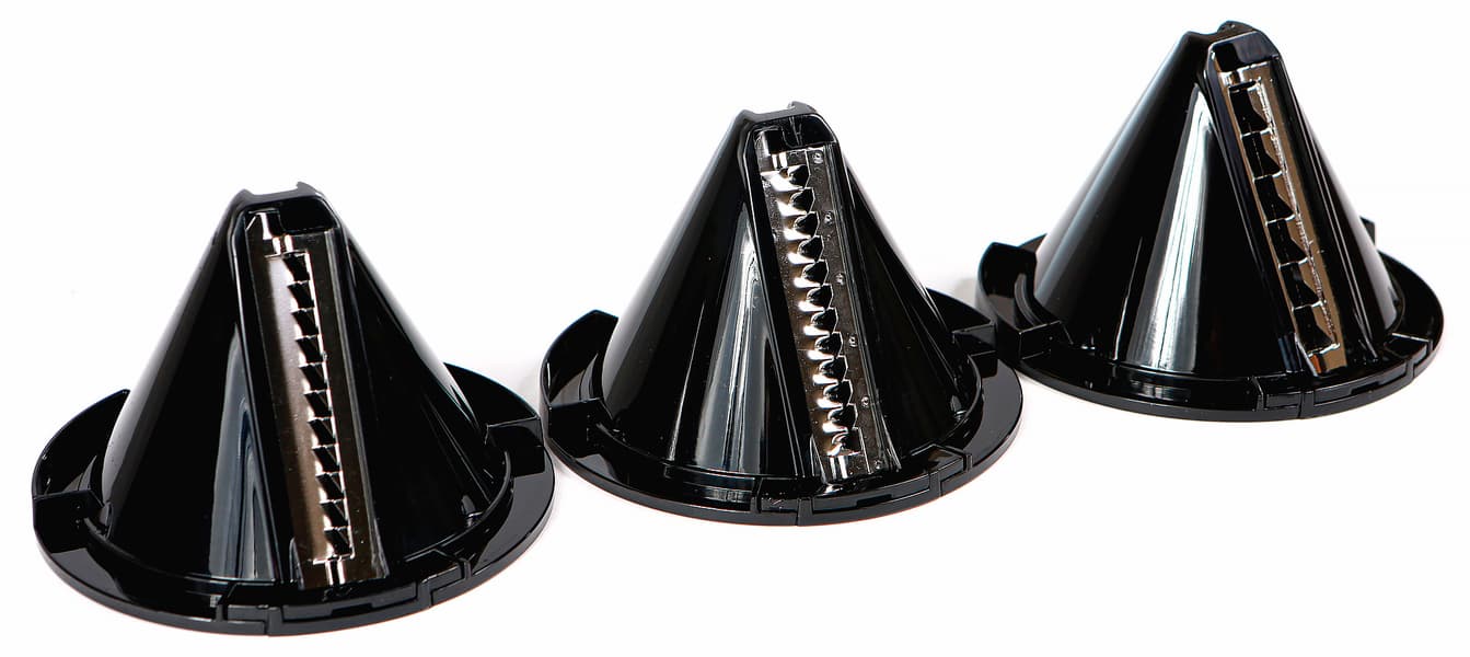 Насадки в форме конусов изготовлены из прочного пластика черного цвета. Ножи — из нержавеющей стали. Прибор оснащен тремя насадками, позволяющими получить спираль разной толщины.