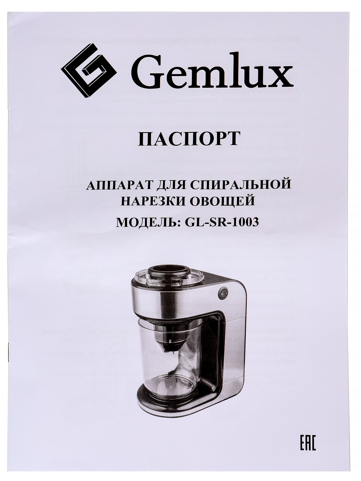 Паспорт Gemlux GL-SR-1003 представляет собой два листа формата А3, согнутые пополам и скрепленные двумя скрепками.