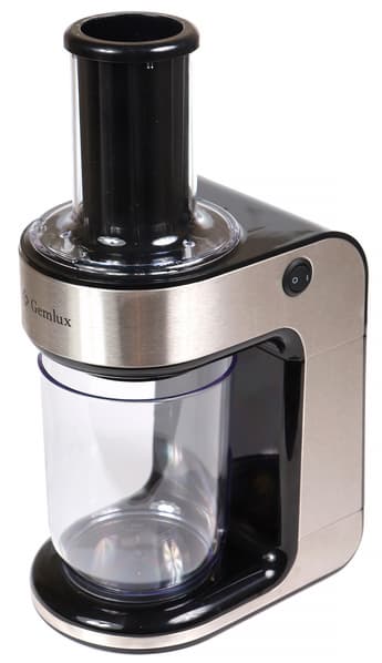 Спиралерезка Gemlux GL-SR-1003 выглядит весьма приятно благодаря использованию простого черного цвета, накладок из нержавеющей стали, скругленных углов и общей простоты форм. Вверху справа на моторном блоке находится кнопка включения/выключения.