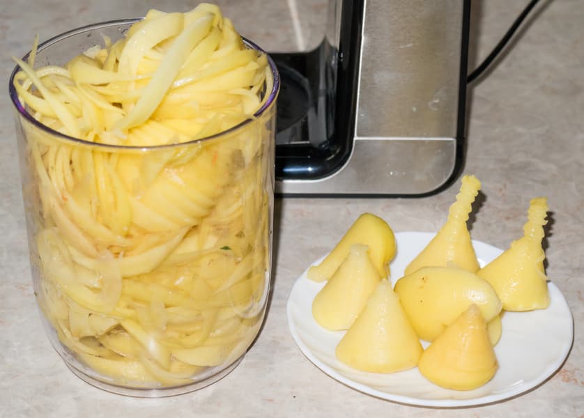 Как мы отметили выше, в горловину хорошо вошли все клубни, кроме одного, диаметр которого оказался слишком велик. Тогда мы отрезали ломтик и протолкнули похудевший клубень внутрь горловины. Спирали широкие и длинные, не рвались как во время нарезки, так и во время работы с ними.