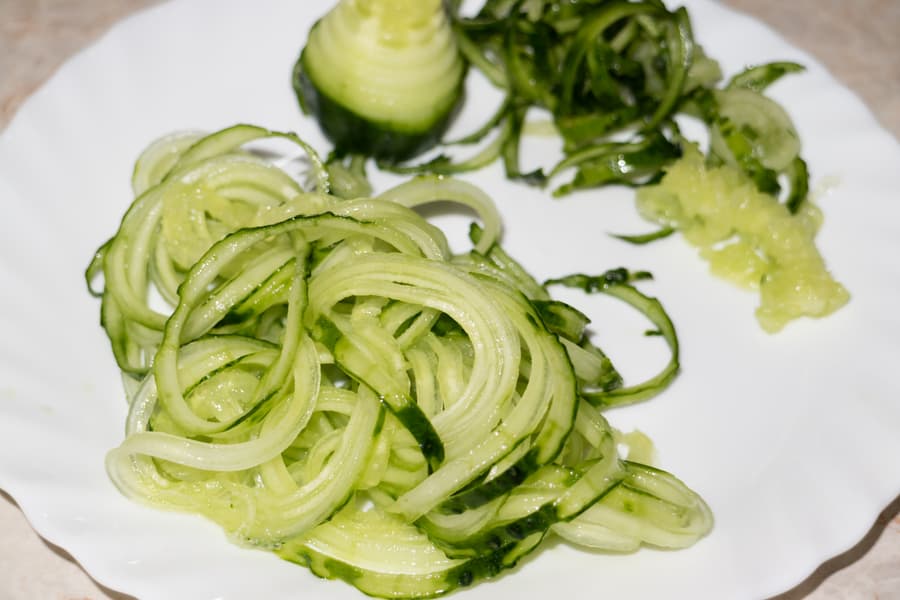 С помощью этой же насадки мы нарезали и огурец. Результат прекрасный — за несколько секунд целый огурец превратился в тонкие и о-о-очень длинные спиральки.