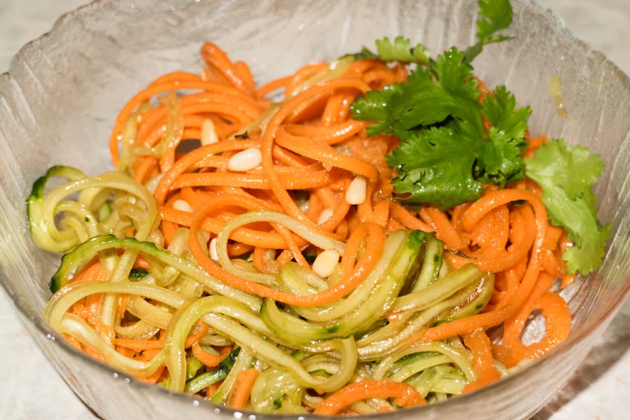 Это, пожалуй, самое известное (в узких кругах) блюдо, для приготовления которого просто необходим спирализатор. С помощью какого иного устройства можно настолько легко и за считанные секунды получить длинные спирали, мы просто не знаем. Кабачок среднего размера был очищен. Для измельчения использовали насадку для средней нарезки.