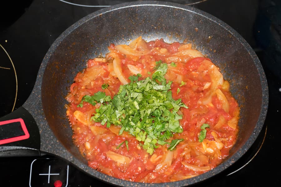 Для соуса обжарили на растительном масле лук и чеснок. Добавили молотый кориандр, красный и черный перец. Затем там же обжарили болгарский перец. В конце положили нарезанные помидоры и посолили. Тушили при открытой крышке, чтобы из соуса ушла лишняя влага. В самом конце всыпали порезанную кинзу.