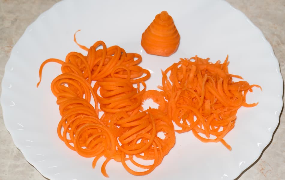 Лучшим результатом мы считаем нарезку самого малого диаметра — спирали длинные, крепкие, тонкие. Отходов в виде недостаточно длинных спиралек практически нет. Толщина кусочков прекрасно подходит для приготовления салатов — морковь пропитается заправкой и приобретет вкус в зависимости от добавок в салатной заправке.