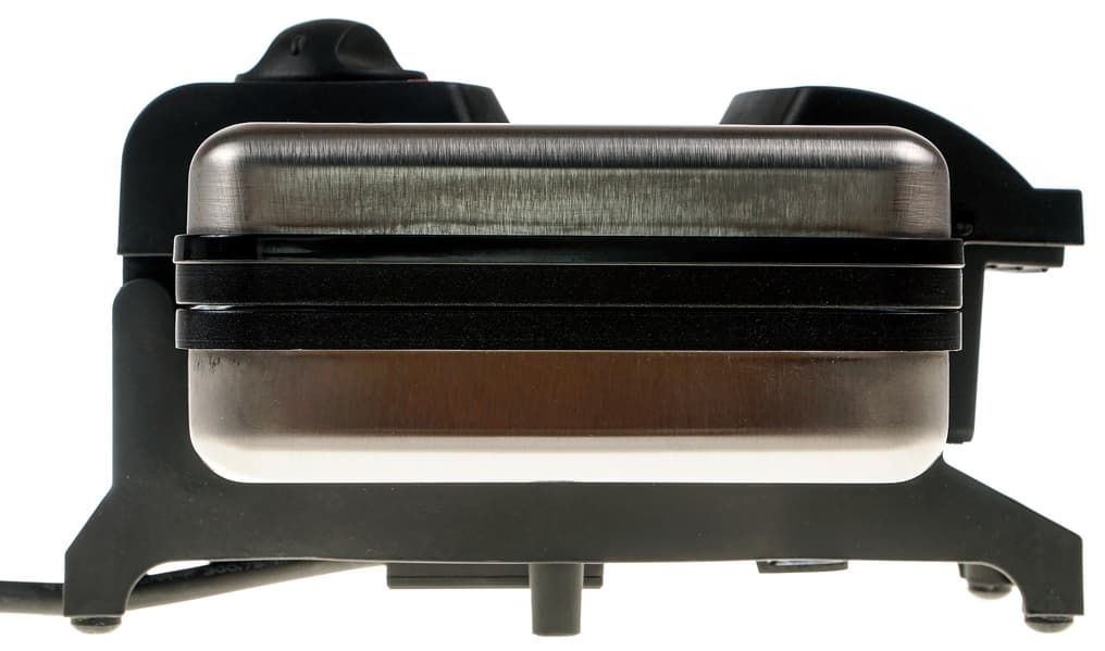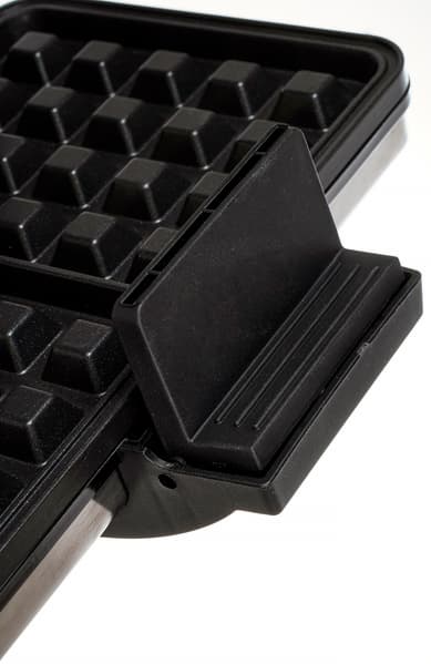 В сомкнутом положении панели вафельницы зафиксированы благодаря накидной защелке. Основание «приподнимает» нижнюю рабочую панель над столом примерно на 3,5 см, что предотвратит деформацию поверхности от воздействия тепла.