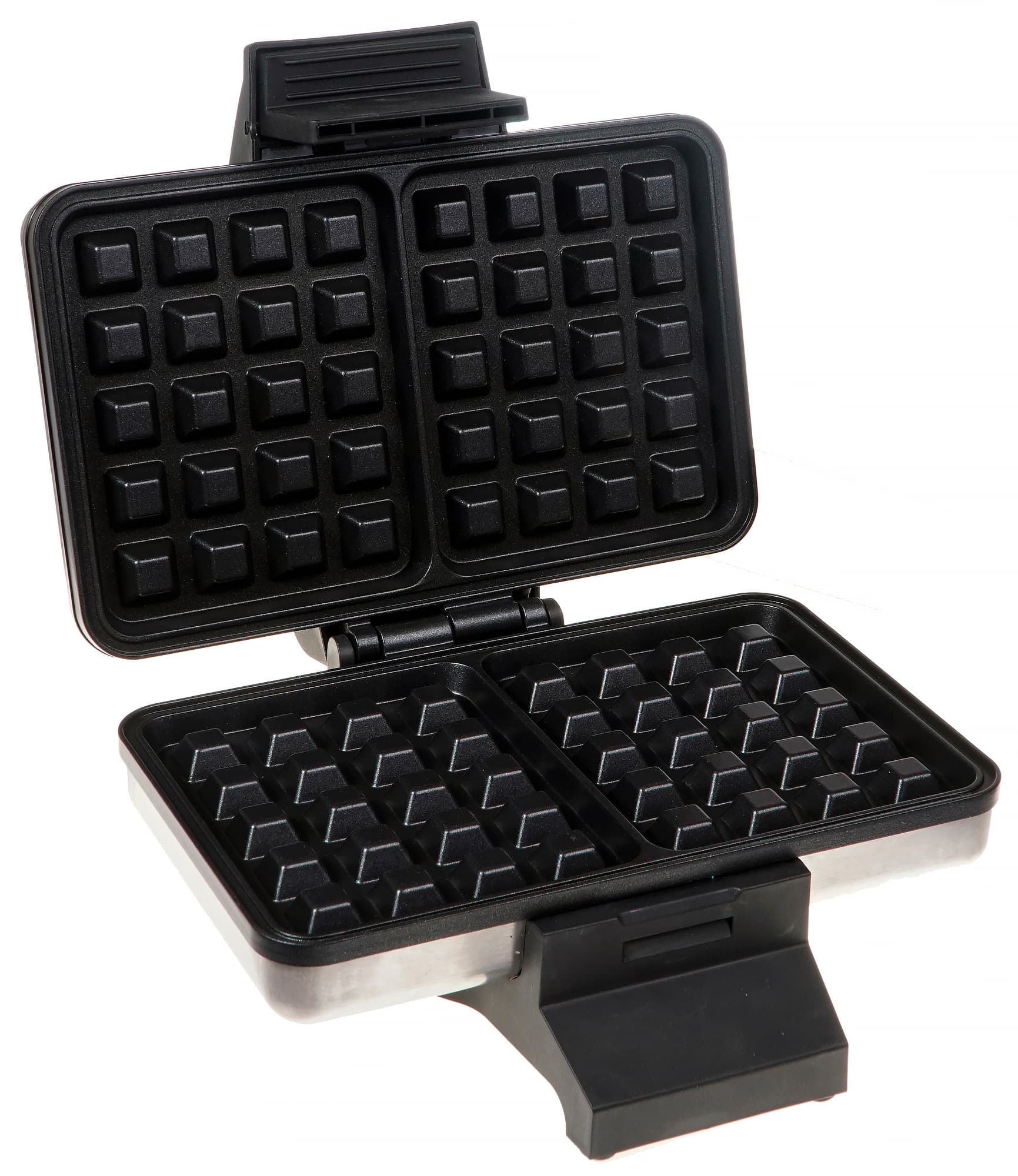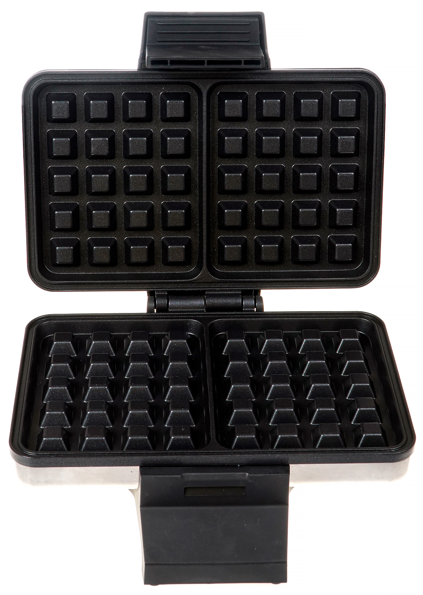 Прибор рассчитан на выпечку пары толстых вафель за один цикл. Фигурные панели несъемные. Изготовлены из алюминиевого сплава и обработаны антипригарным покрытием. Покрытие производит впечатление долговечного и качественного. Нанесено ровно, с одинаковой толщиной по всей поверхности и боковым сторонам панелей. При осмотре не обнаружено шероховатостей или сколов. Размер рабочей зоны панелей 22×13,5 см. Размер одной вафли — 10×12 см.