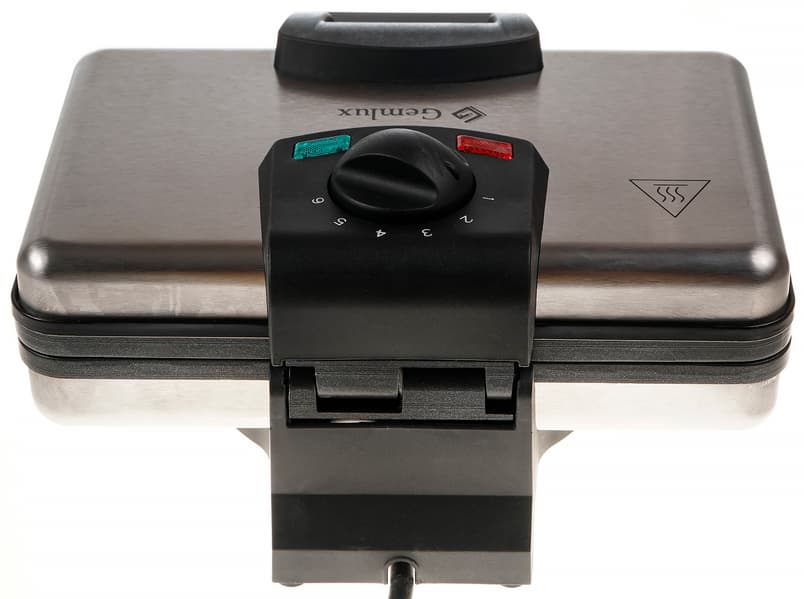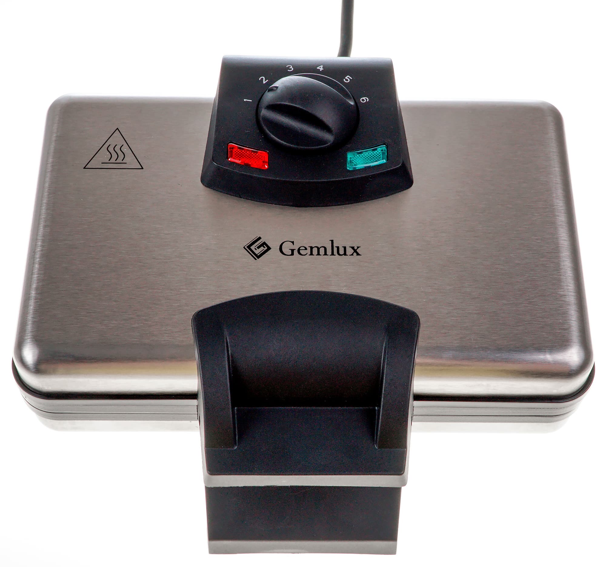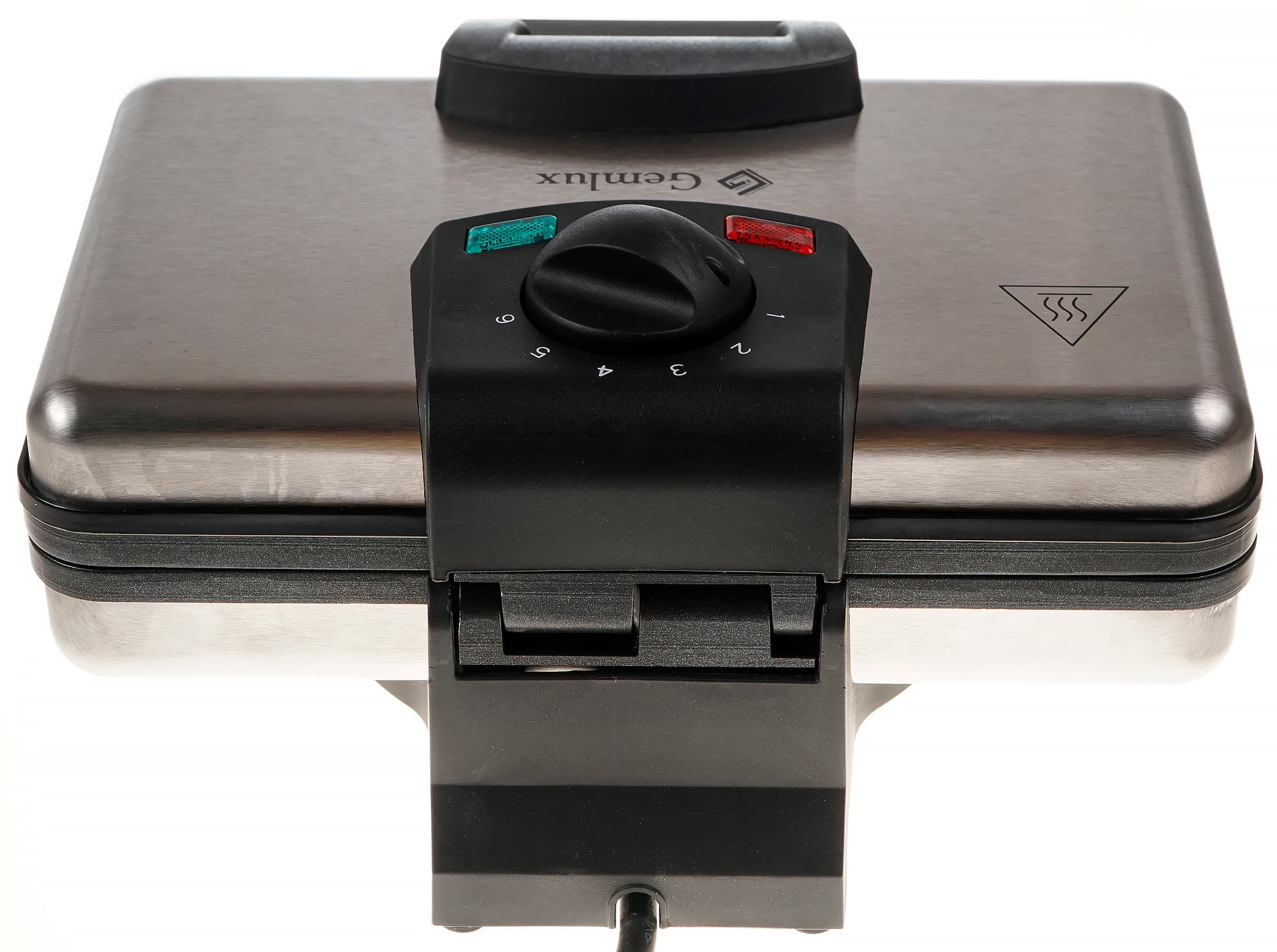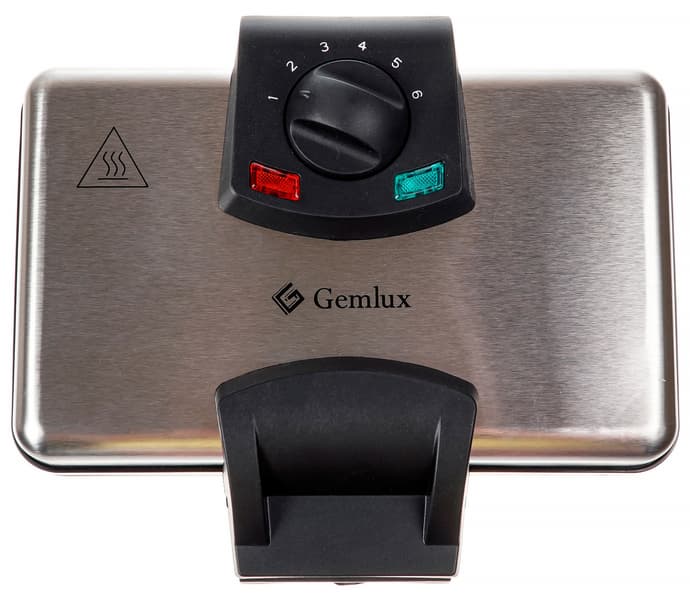 Вафельница Gemlux GL-WM849 весьма компактна. Представляет собой основание, в котором закреплена нижняя жарочная панель, и верхнюю откидную панель с ручкой. На верхней панели расположены регулятор режимов нагрева и два индикатора: подключения к сети и готовности к работе. Основание, верхняя ручка и панель управления изготовлены из термостойкого пластика, корпус вафельницы — из нержавеющей стали.