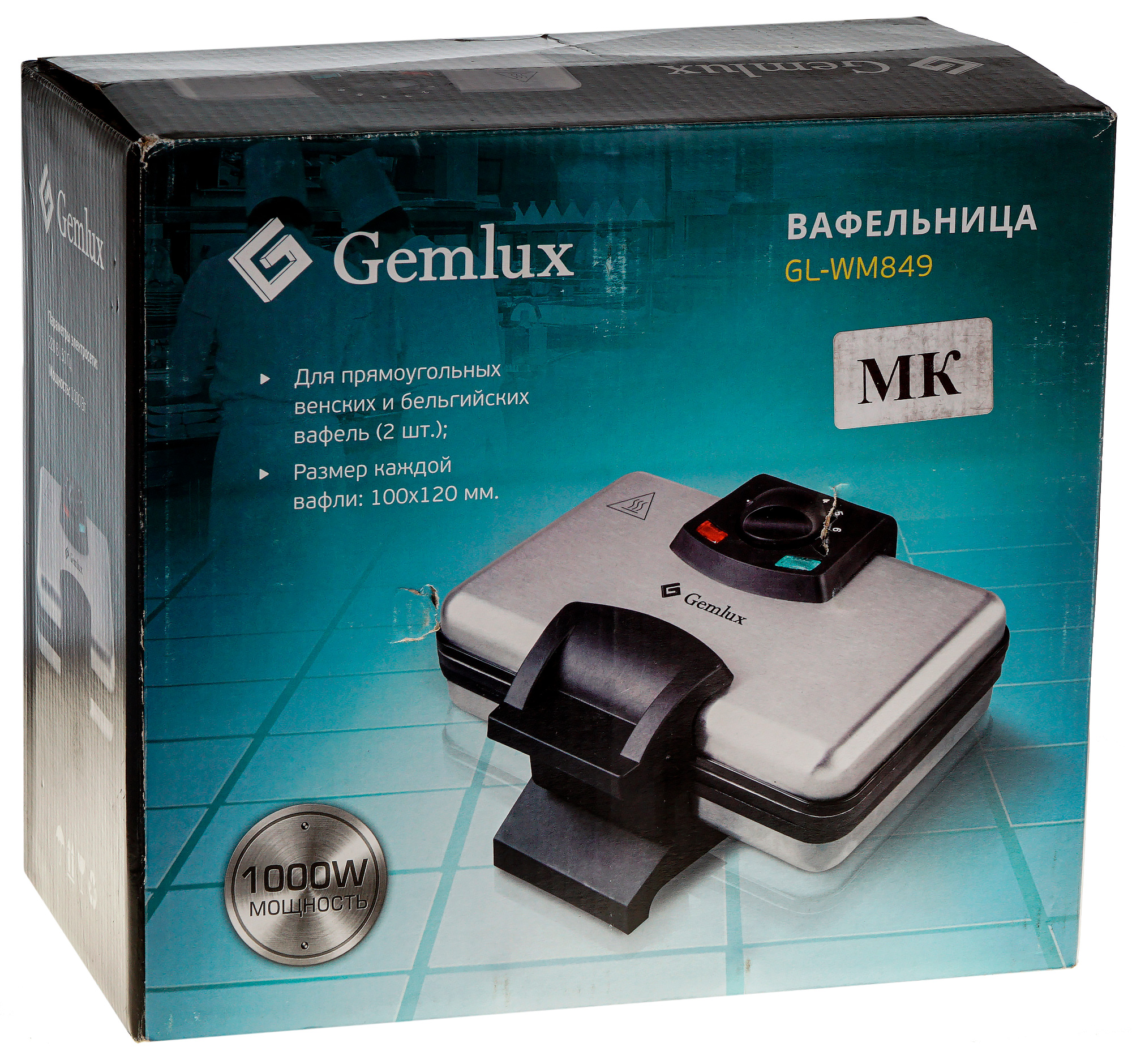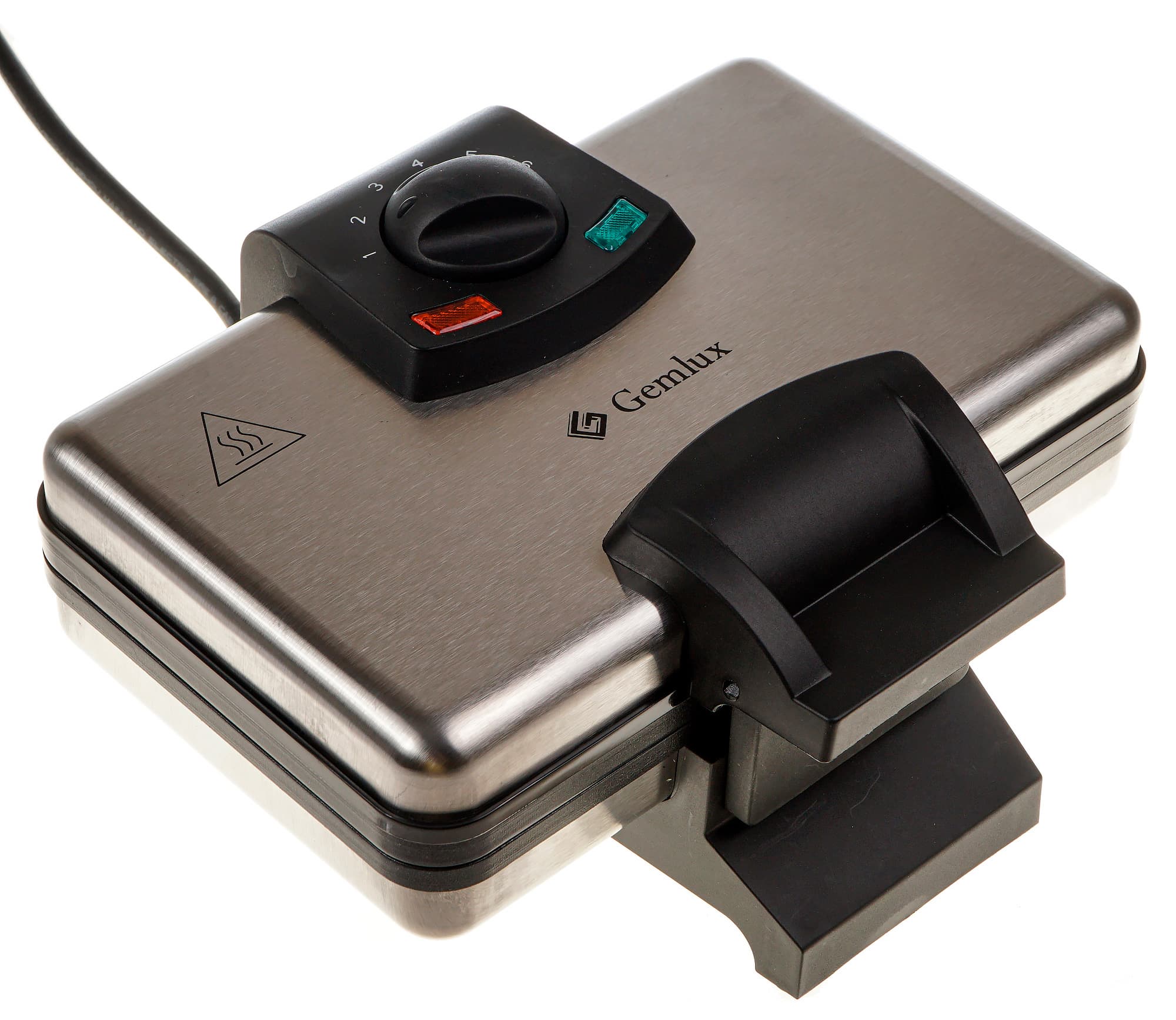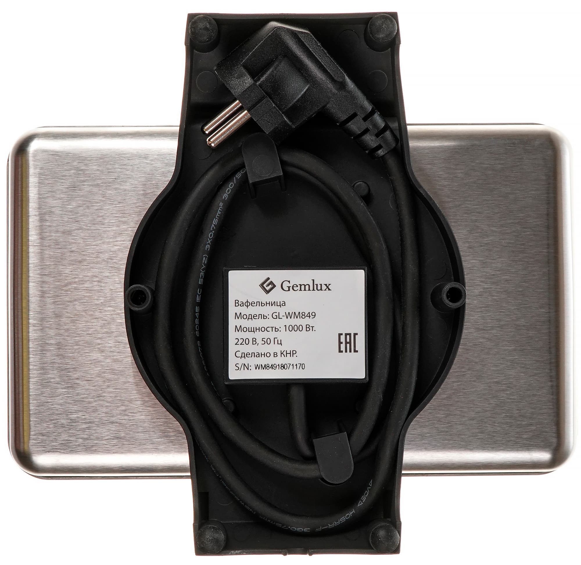 Вафельница Gemlux GL-WM849 весьма компактна. Представляет собой основание, в котором закреплена нижняя жарочная панель, и верхнюю откидную панель с ручкой. На верхней панели расположены регулятор режимов нагрева и два индикатора: подключения к сети и готовности к работе. Основание, верхняя ручка и панель управления изготовлены из термостойкого пластика, корпус вафельницы — из нержавеющей стали.