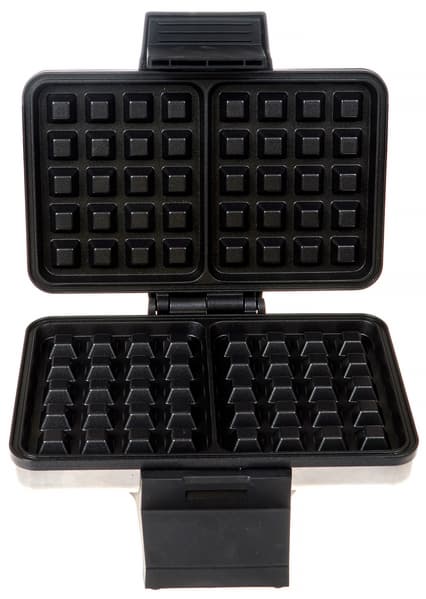 Вафельница располагается надежно и устойчиво в раскрытом виде. Желания придержать верхнюю панель не возникает. В открытом положении панели расположены друг по отношению к другу под углом более 90°, так что закладывать тесто будет легко, а риск испачкать верхнюю жарочную поверхность отсутствует. Крышка поднимается и опускается плавно, без скрипа и щелчков.