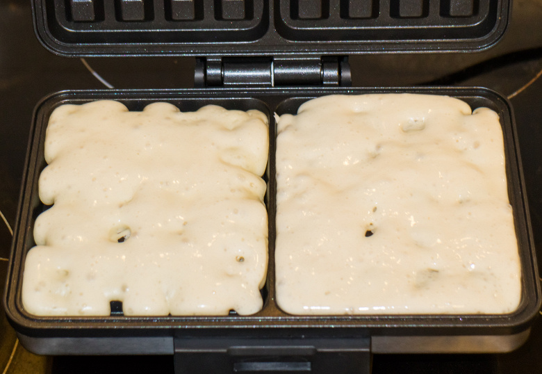 Тесто получается густое, поэтому клали в каждую форму по полторы ложки с горкой, слегка разравнивали, не стараясь создать квадрат, и накрывали крышкой. Готовили на максимальном температурном режиме около 12 минут.