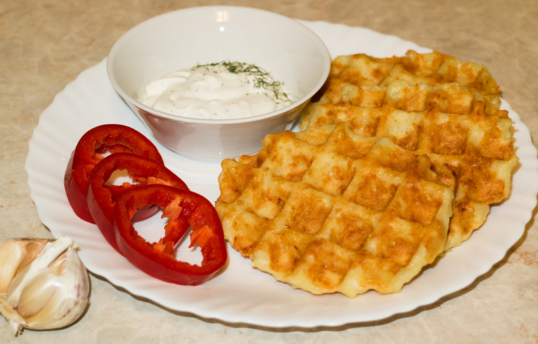 Всего испекли 6 картофельных вафель. За все это время прибор потребил 0,228 кВт·ч. Запах от вафельницы шел совершенно феерический. Пока жарились вафли, подготовили соус: смешали свежую сметану с парой зубчиков давленного чеснока, солью и укропом.