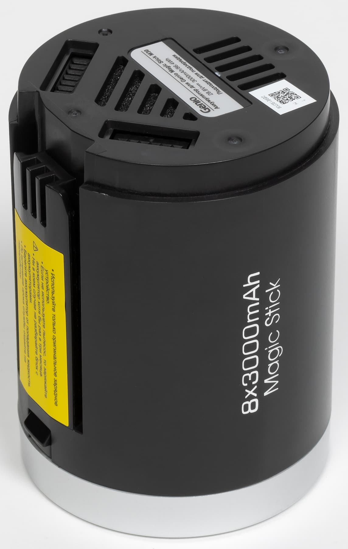 Согласно информации на аккумуляторе, сборка состоит из восьми элементов емкостью 3000 мА·ч. Элементы подключены параллельно, что повышает надежность системы: при выходе из строя одной из батарей пылесос продолжает работу.