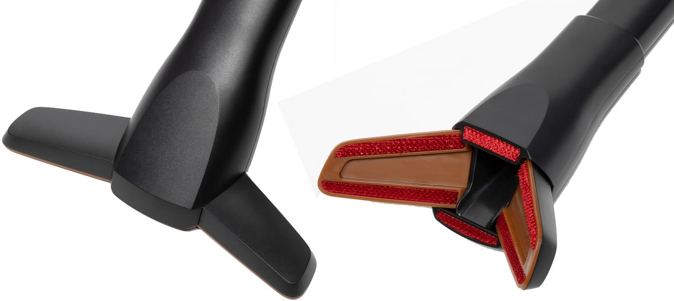 На нижней части насадки закреплена велюровая накладка алого цвета, облегчающая скольжение по мебельной ткани.