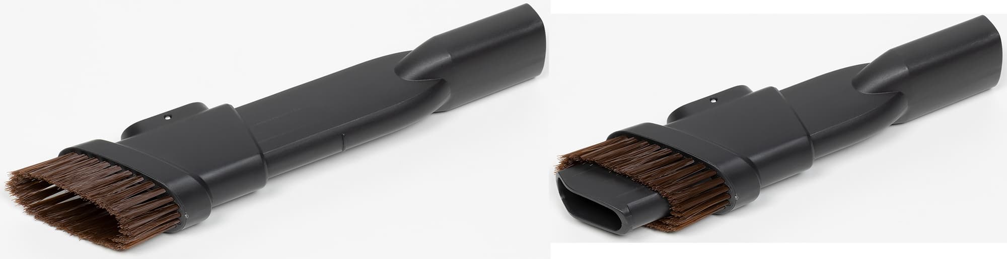Щелевые насадки-щетки «2 в 1» мы видели уже во многих моделях: в сложенном состоянии ими можно чистить труднодоступные участки, а часть с довольно длинной щетиной выдвигается при необходимости и фиксируется защелками на корпусе.
