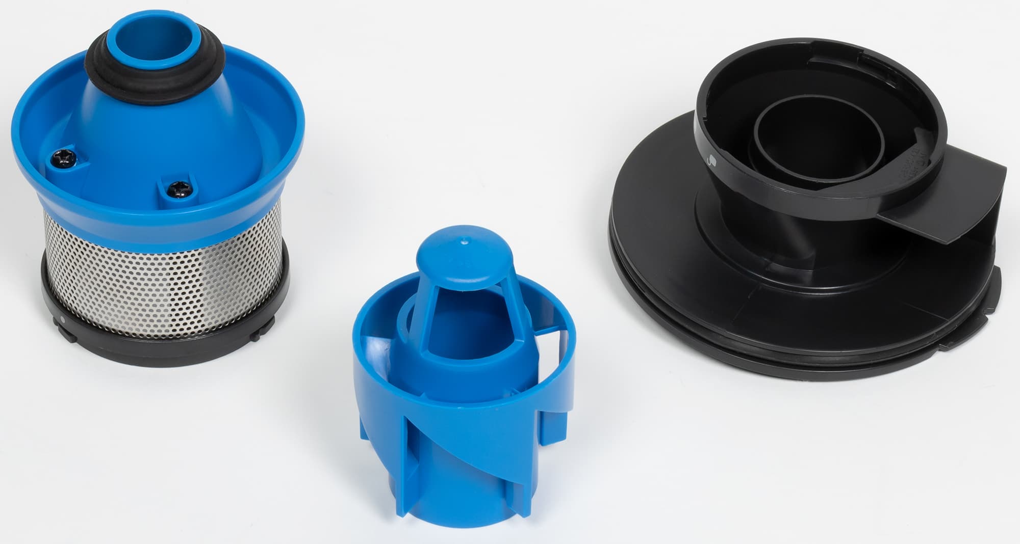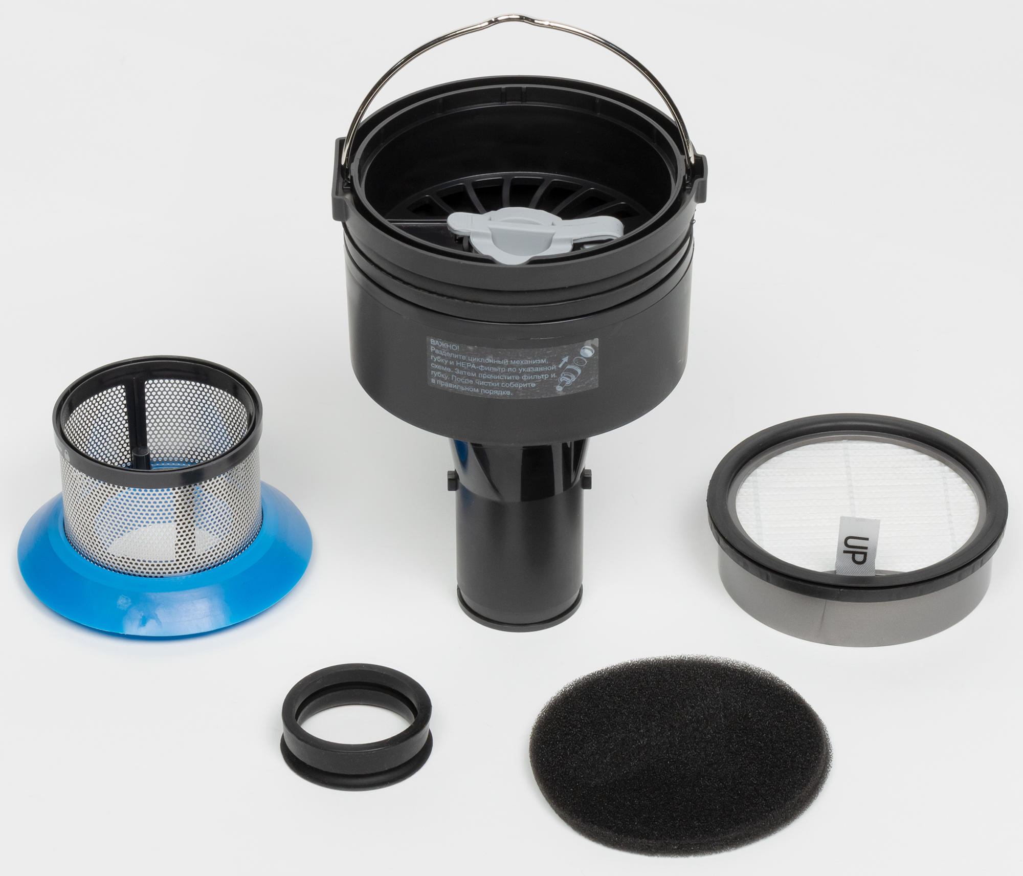 Циклонный элемент полностью разборный и состоит из трех ступеней: двух аэродинамических элементов и блока фильтрации — металлической сетки, сепарирующей крупный мусор. Ячейки здесь чуть крупнее аналогичных в моторном блоке.