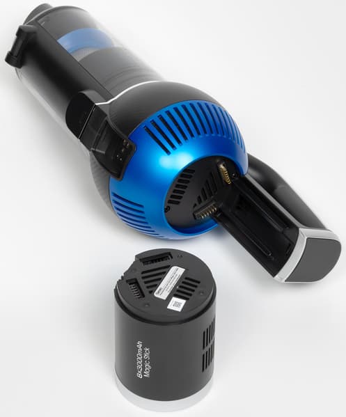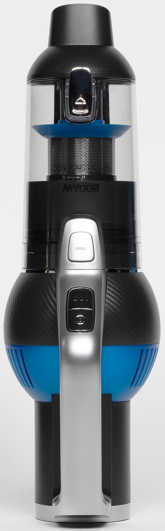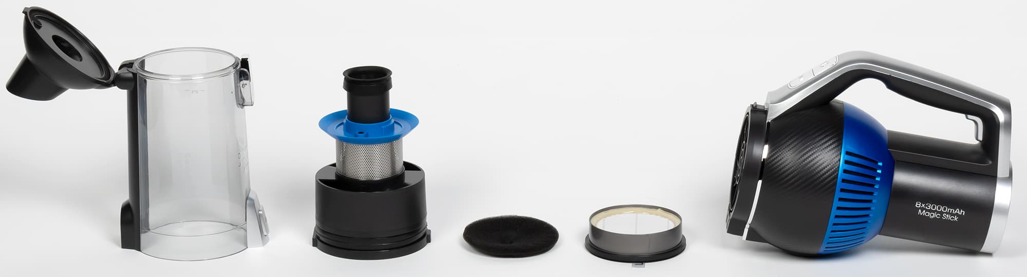 Пылесос скомпонован вдоль вертикальной оси: в передней части моторного блока расположен цилиндрический мусоросборник с циклонным фильтром, центральную часть занимает двигатель, а съемный аккумуляторный блок находится в задней части.