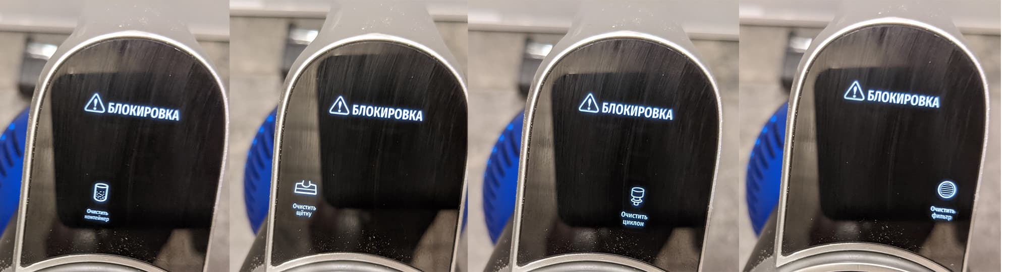 При переполнении мусоросборника или засорении воздушного тракта пылесос снижает мощность, а на дисплее появляется предупреждающее сообщение. Под ним попеременно мигают иконки «Очистить контейнер», «Очистить щетку», «Очистить фильтр», «Очистить циклон».