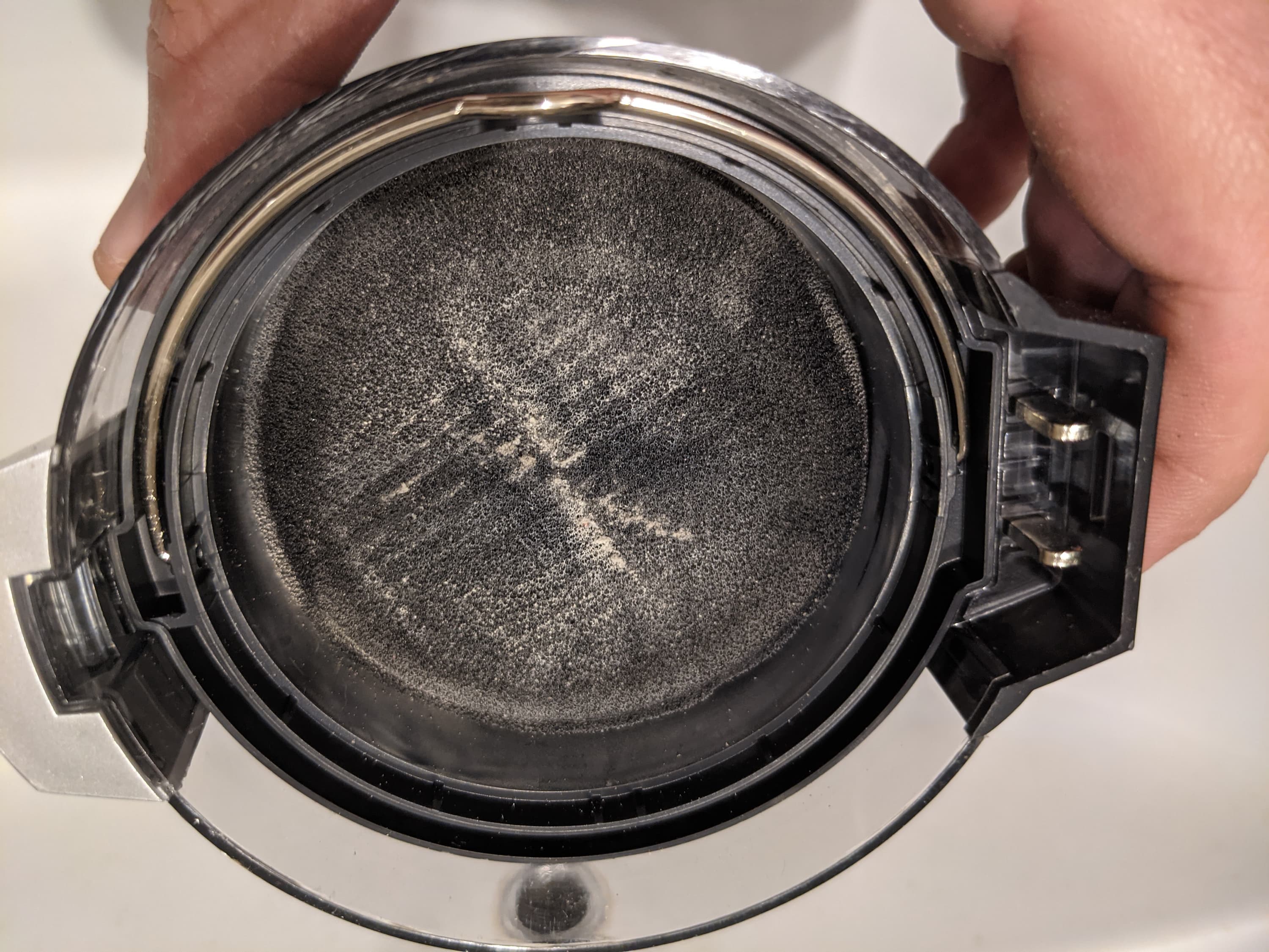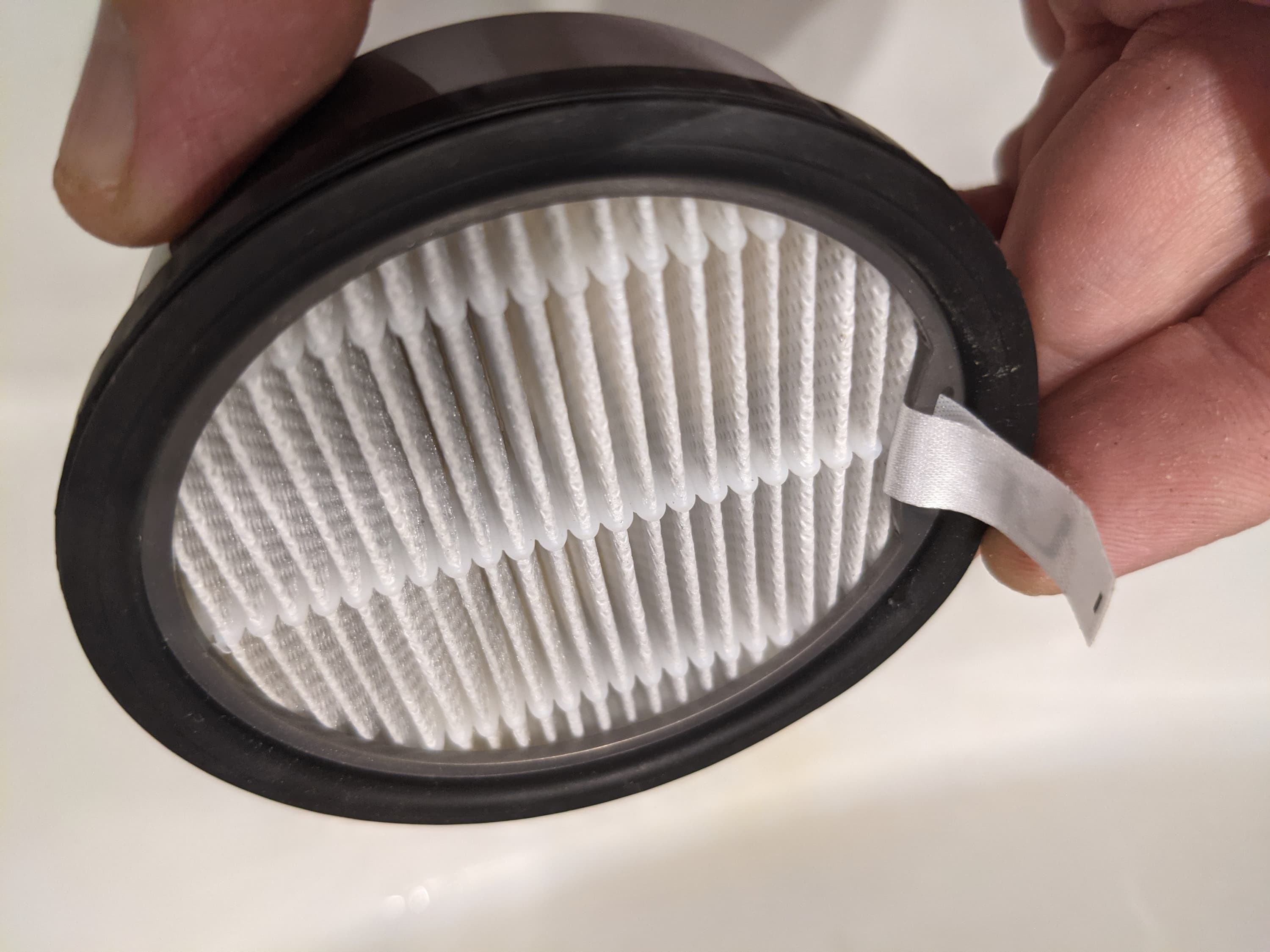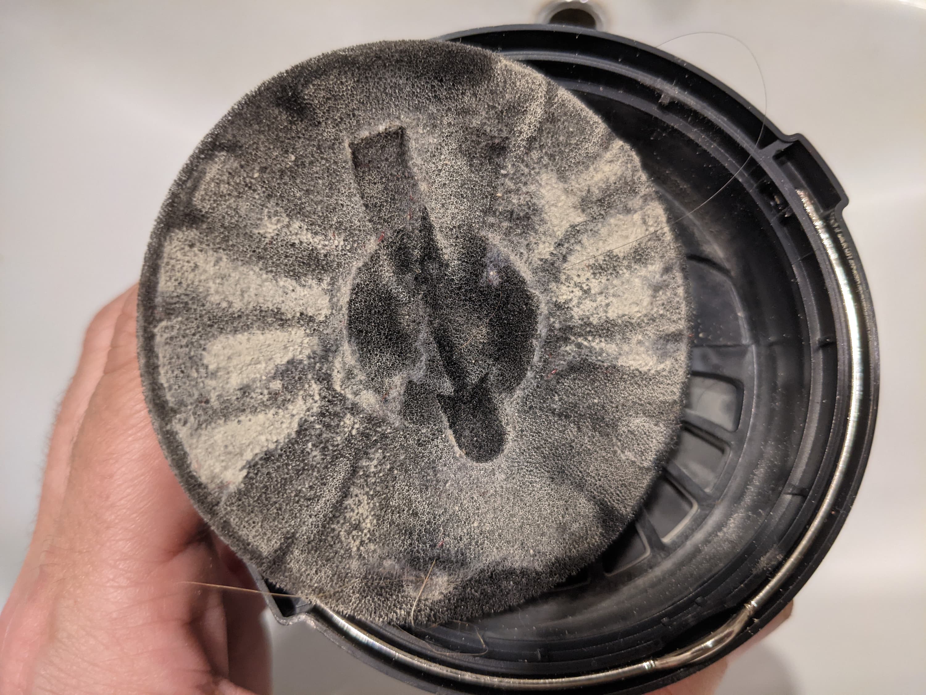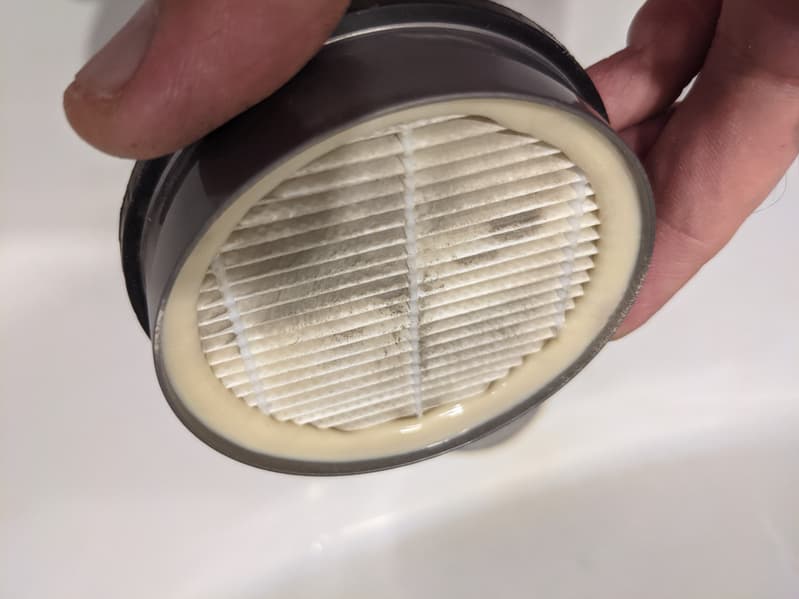 На внутренней поверхности HEPA-фильтра после нескольких активных уборок мы увидели явные следы пыли.