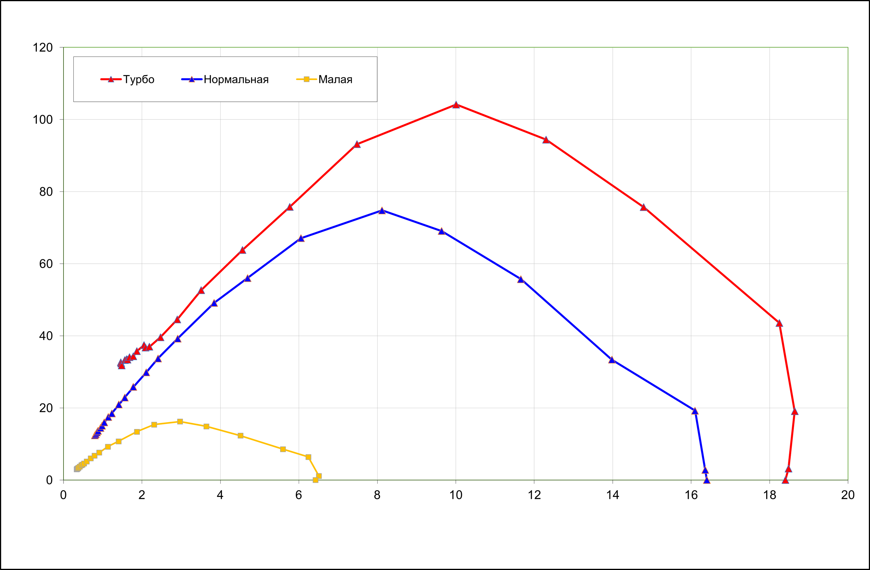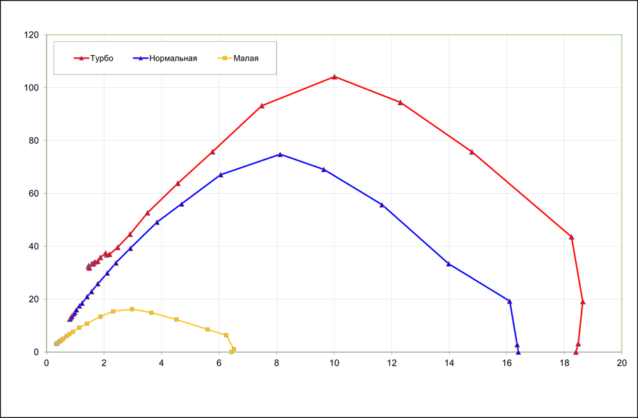 Мощность всасывания (что это такое и как мы ее измеряем, описано в отдельной статье) мы определяли при работе пылесоса без без удлинительных трубок и насадок, во всех трех режимах. В силу конструктивных особенностей пылесоса измерения проводились в ручной конфигурации устройства, без использования второго циклонного фильтра. Зависимость мощности всасывания от создаваемого разрежения приведена на графике ниже: