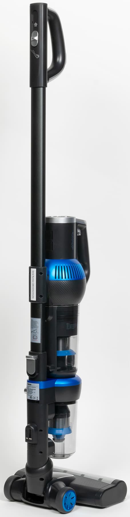 В конфигурации для уборки пола пылесос показался нам довольно увесистым и не слишком хорошо сбалансированным. Из-за особенностей крепления моторного блока центр тяжести у него находится довольно низко, а второй пылесборник, расположенный в самом низу, дополнительно ухудшает баланс. Не добавляет удобства и конструкция удлинительной ручки: ее приходится держать так, что вся нагрузка падает на запястье рабочей руки, изогнутое не вполне естественным образом.