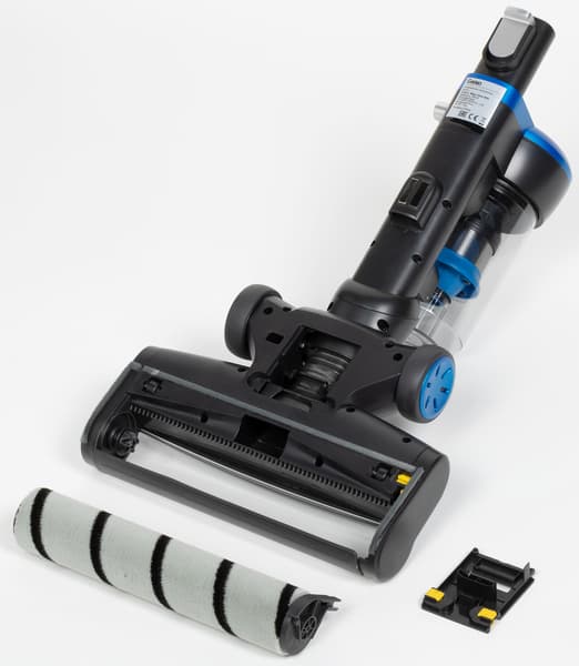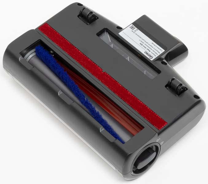 Щетина у моторной щетки средней длины. Валик можно снять для чистки с помощью защелки желтого цвета на правой части насадки. По бокам от вращающегося элемента и в задней части располагаются уплотнительные полоски, которые улучшают прилегание к полу. Основной вес при уборке приходится на два пластиковых колеса.