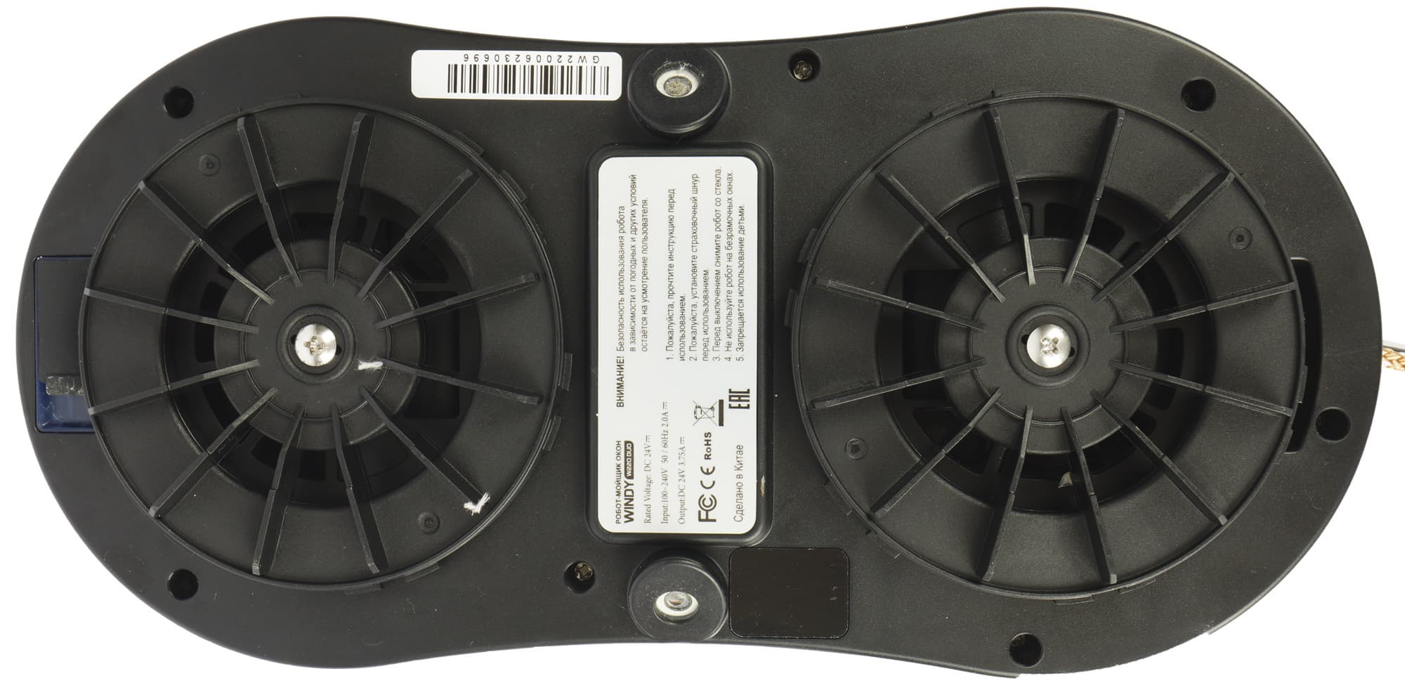Прижимную силу робота к стеклу обеспечивает скрытый в корпусе бесщеточный мотор с силой всасывания 2800 Па. Два съемных пластиковых круглых колеса на дне корпуса выполняют роль присосок. Колеса фиксируются на корпусе защелкиванием.