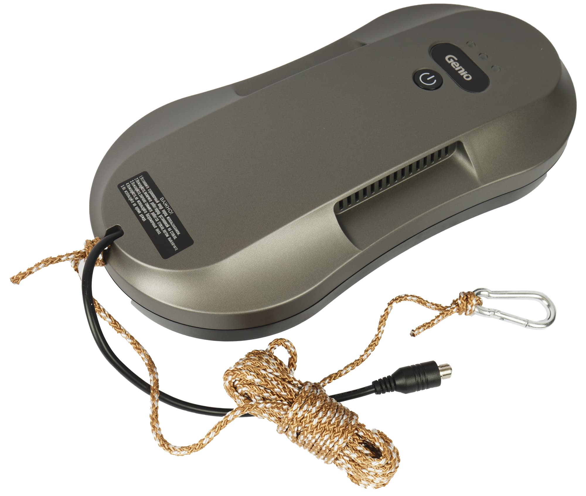Небольшое возвышение в верхней панели одновременно, по обеим сторонам прячет в себе решетки вентиляции и является удобным элементом для захвата робота рукой. Наверху панели мы видим механическую кнопку включения, вставку с логотипом Genio, а над ней три индикатора. В нижней части — наклейка с предостережениями, касающимися эксплуатации.