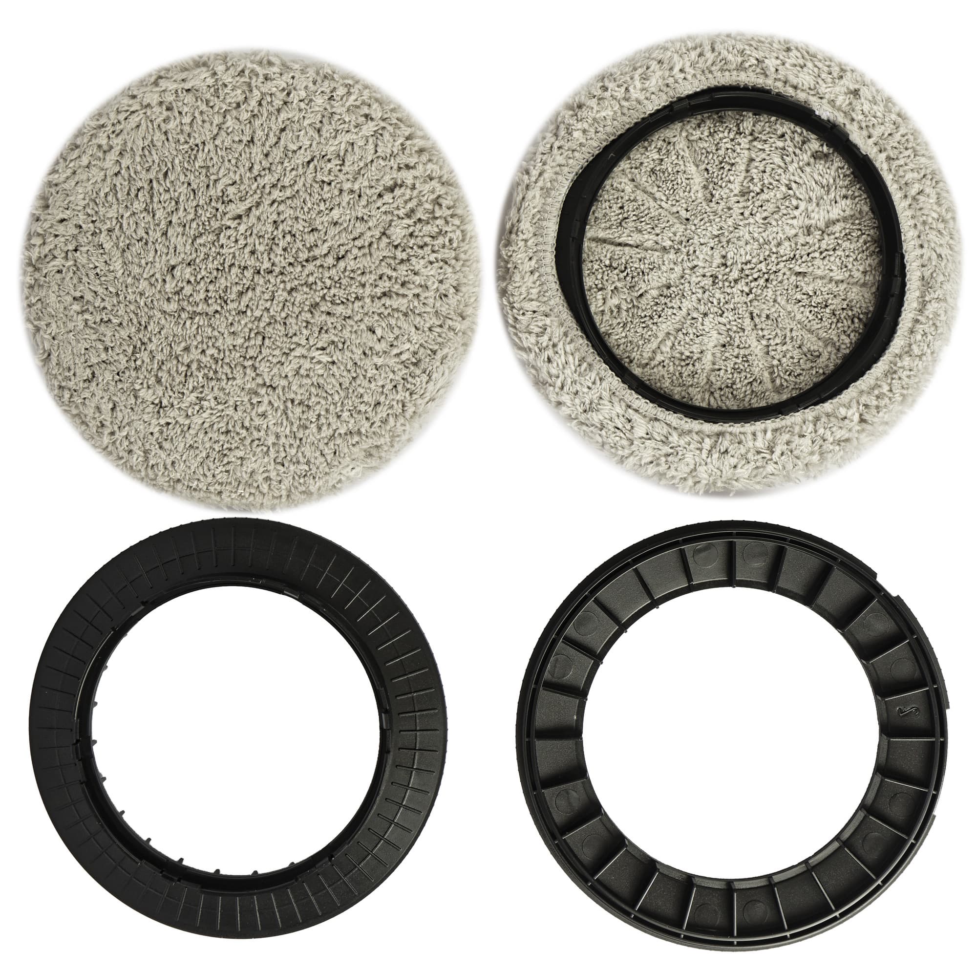 На колеса надеваются мягкие махровые салфетки из микрофибры, они же мопы. В салфетки вшиты тугие резинки, за счет чего на колесах они держатся очень крепко. Диаметр каждой чистящей поверхности — 14,5 см.