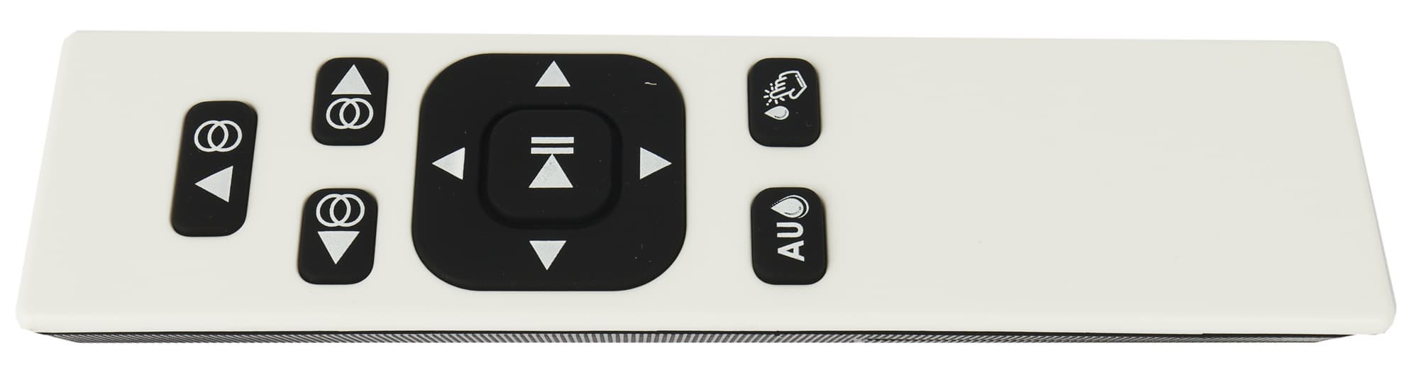 Дополнительные возможности открываются при применении пульта. Большая кнопка в середине запускает и останавливает уборку в авторежиме. Стрелки вокруг позволяют направлять робота в выбранную сторону.