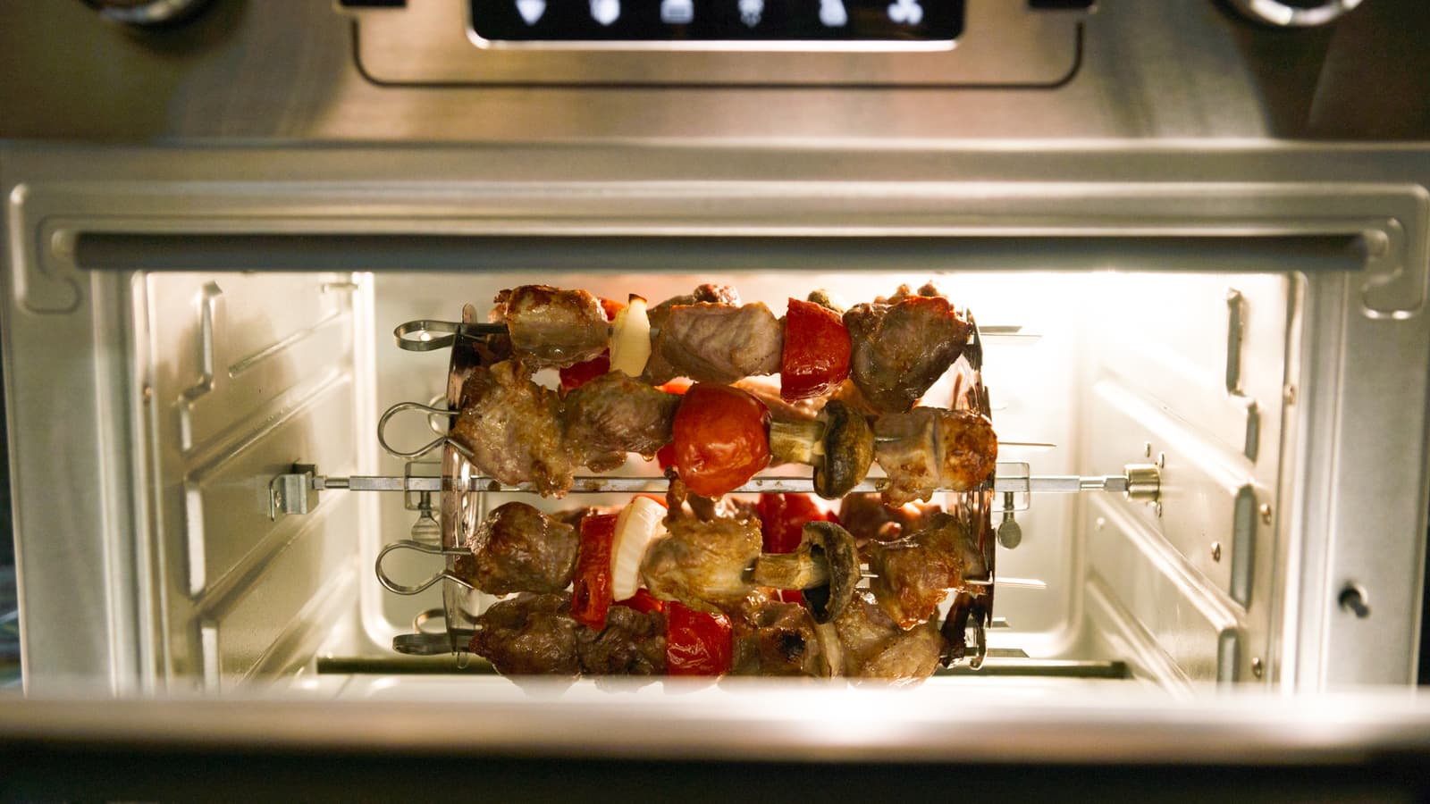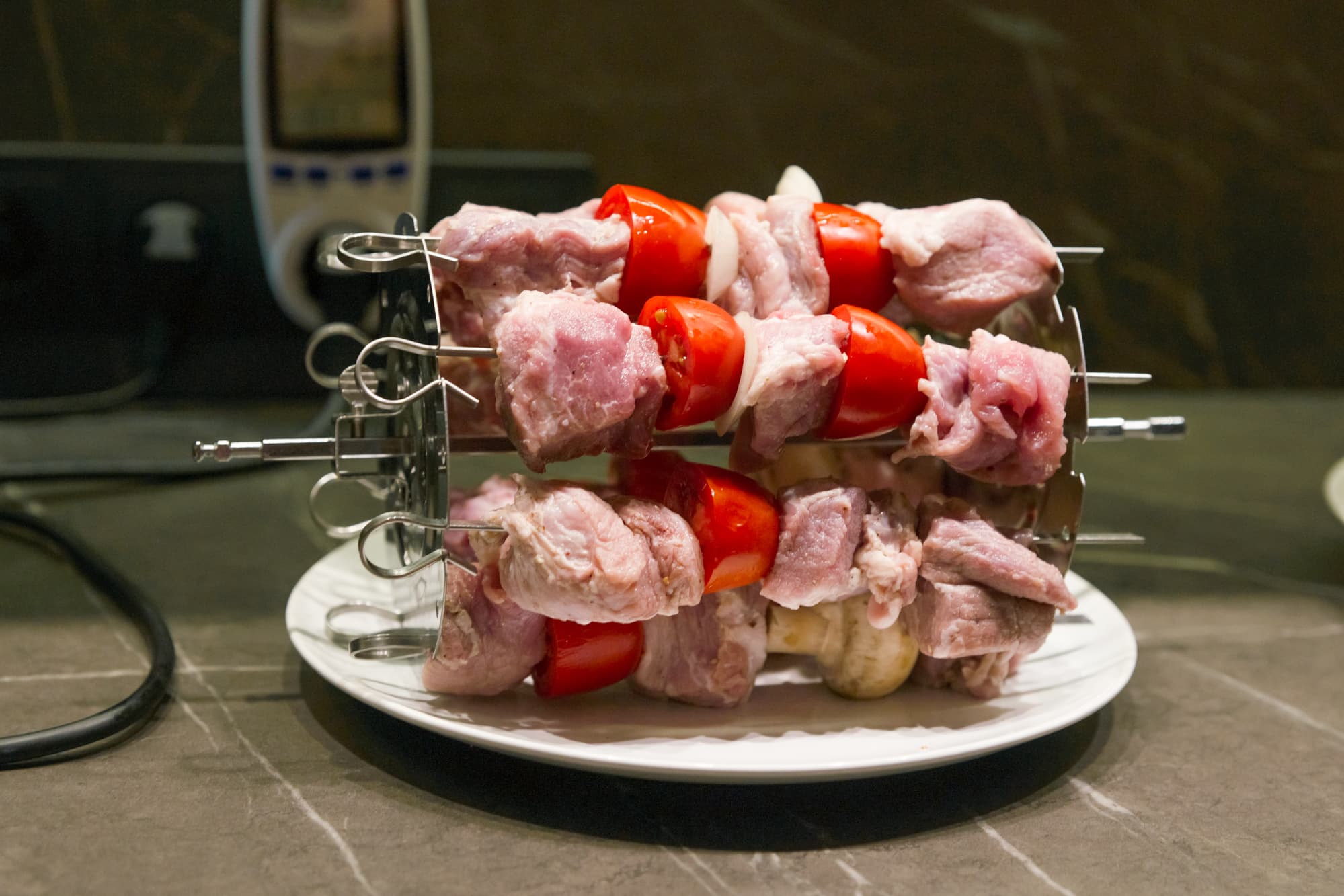 Шашлычница тоже должна проворачиваться, поэтому ей подходит такой же режим, как для курицы. Ориентируясь на рецепты из инструкции, мы выставили 180 °C на 30 минут.