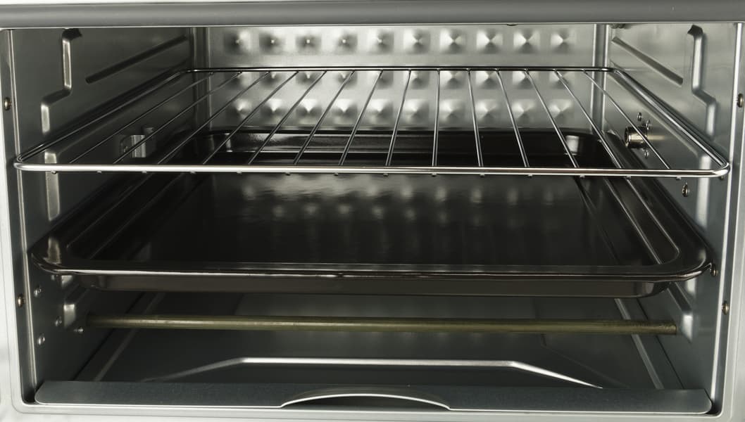 На дне находятся четыре крупные пластиковые ножки с резиновыми вставками по центру. Ножки приподнимают корпус над поверхностью стола почти на 3 см. Мини-печь держится устойчиво и легко с места не сдвигается.