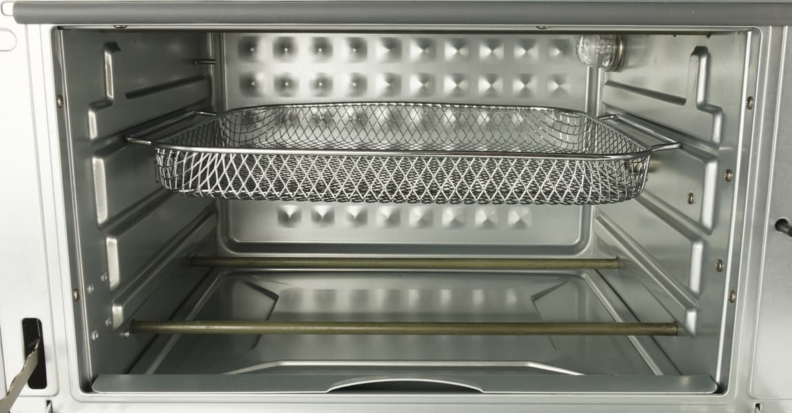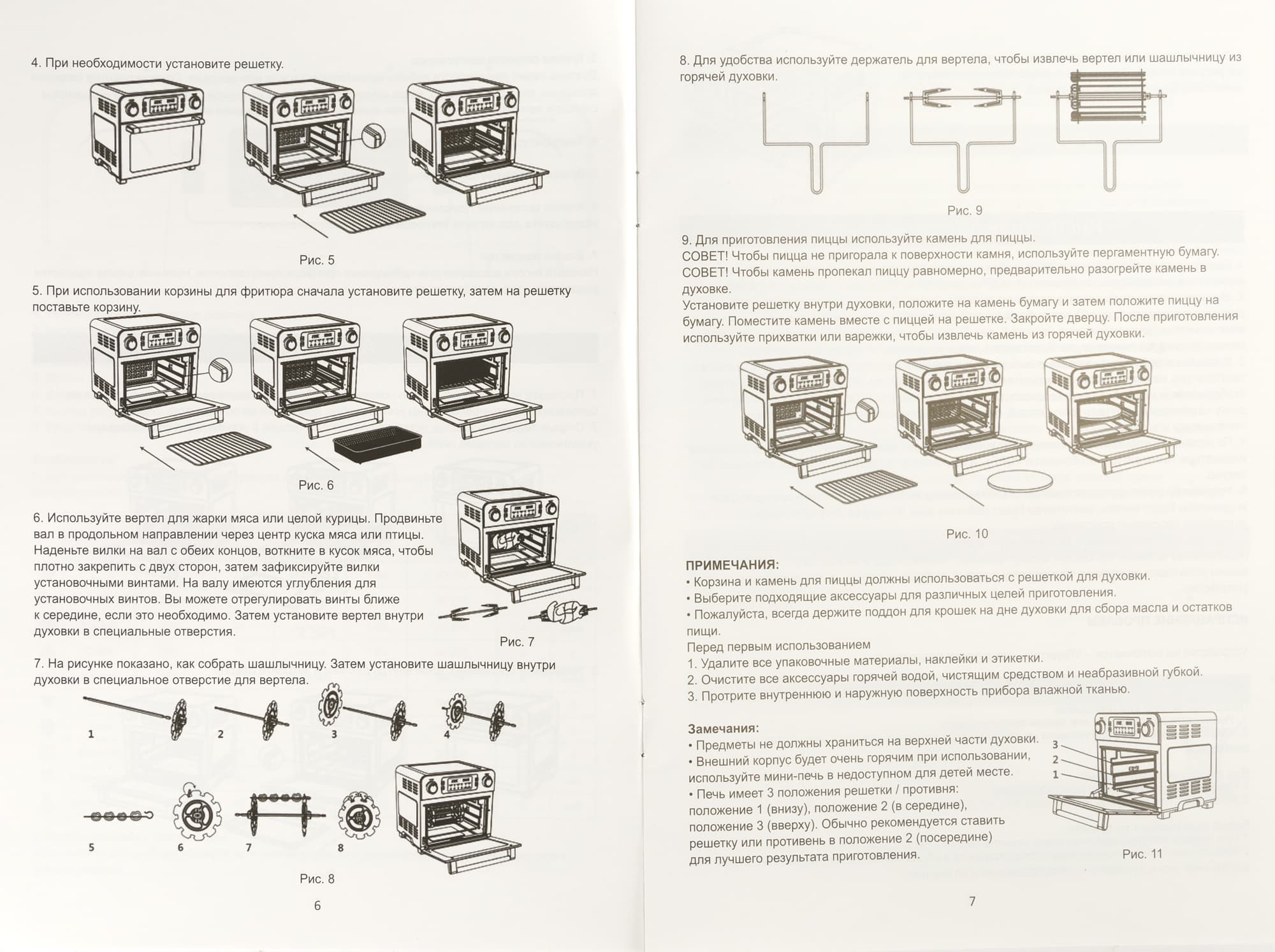 В комплект мини-печи входят: вертел с зажимами, шашлычница с 8 шампурами, решетка, противень, корзинка для фритюра с высотой бортиков чуть меньше 3 см и керамический камень для пиццы диаметром 25,5 см и толщиной около 6 мм.
