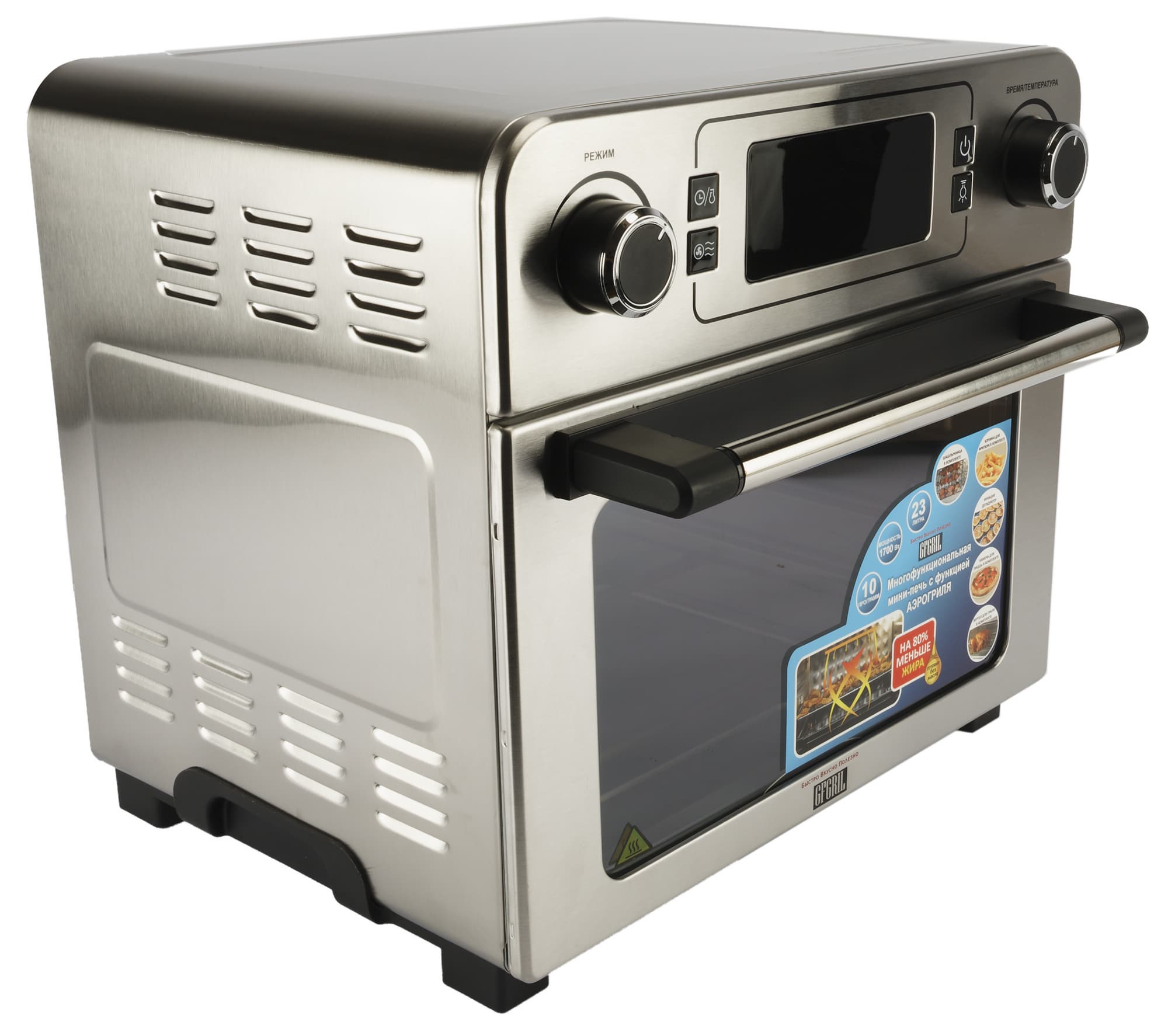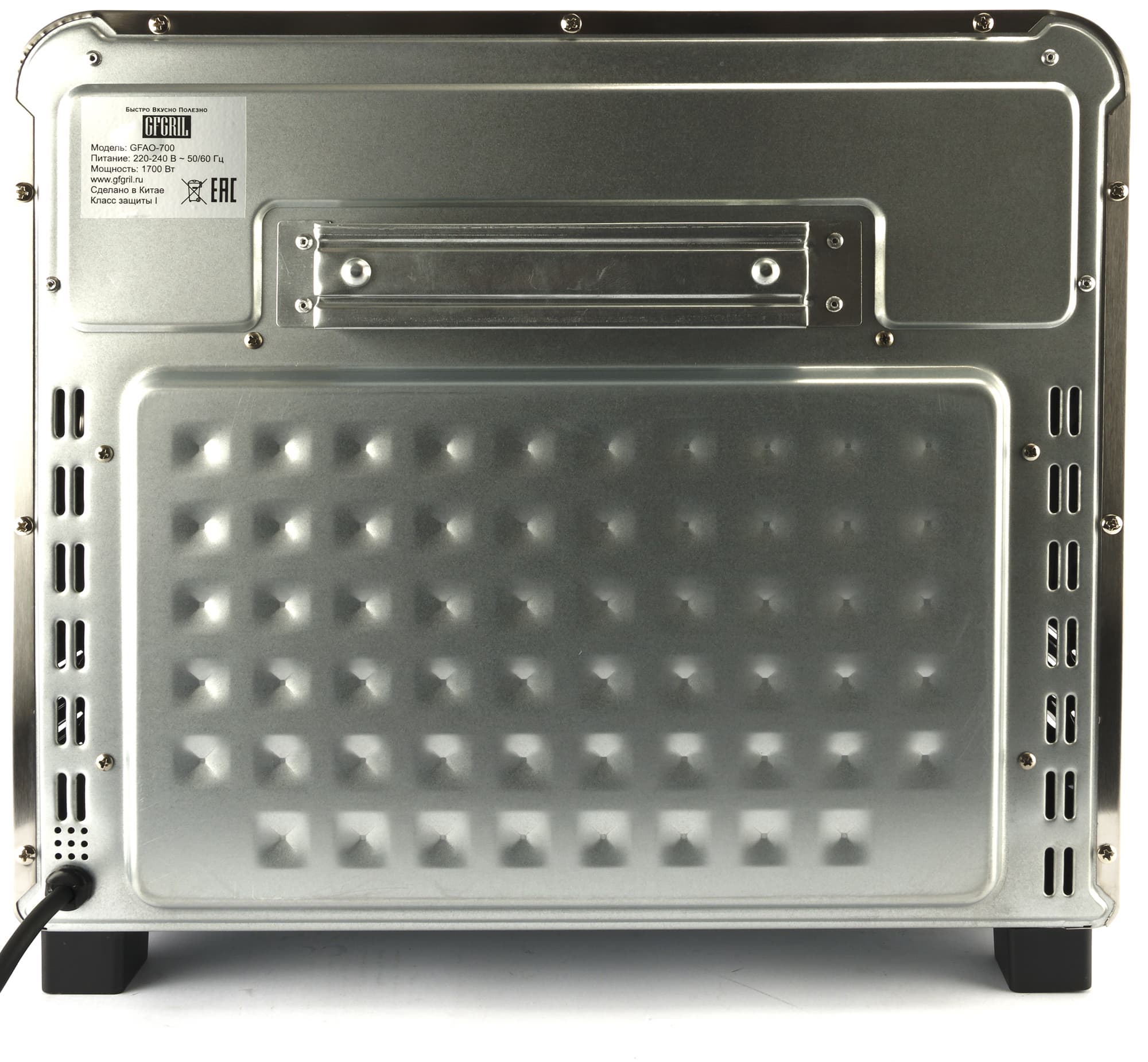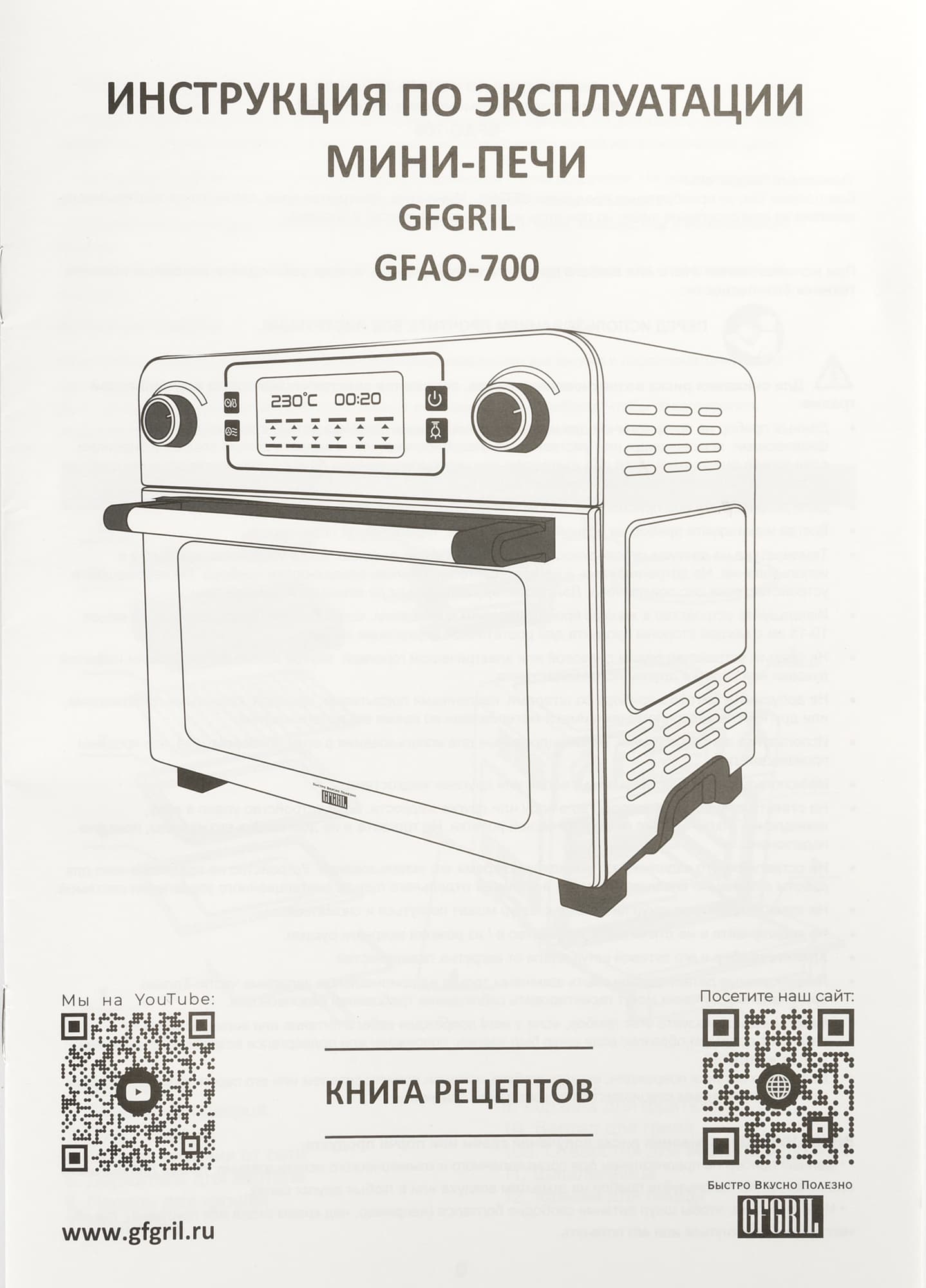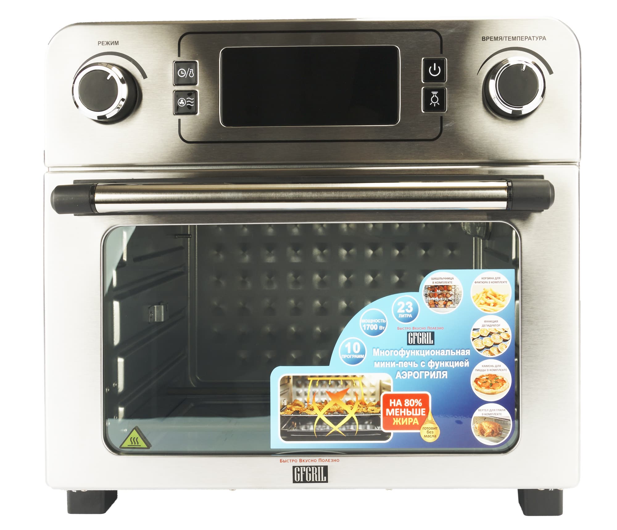 Мини-печь GFgril GFAO-700 с функцией аэрогриля, шашлычницей, вертелом для гриля и камнем для пиццы — это хороший и предсказуемый прибор для домашнего использования. Объем рабочей камеры составляет 23 л, что позволяет готовить за один раз на 2-3 человек.