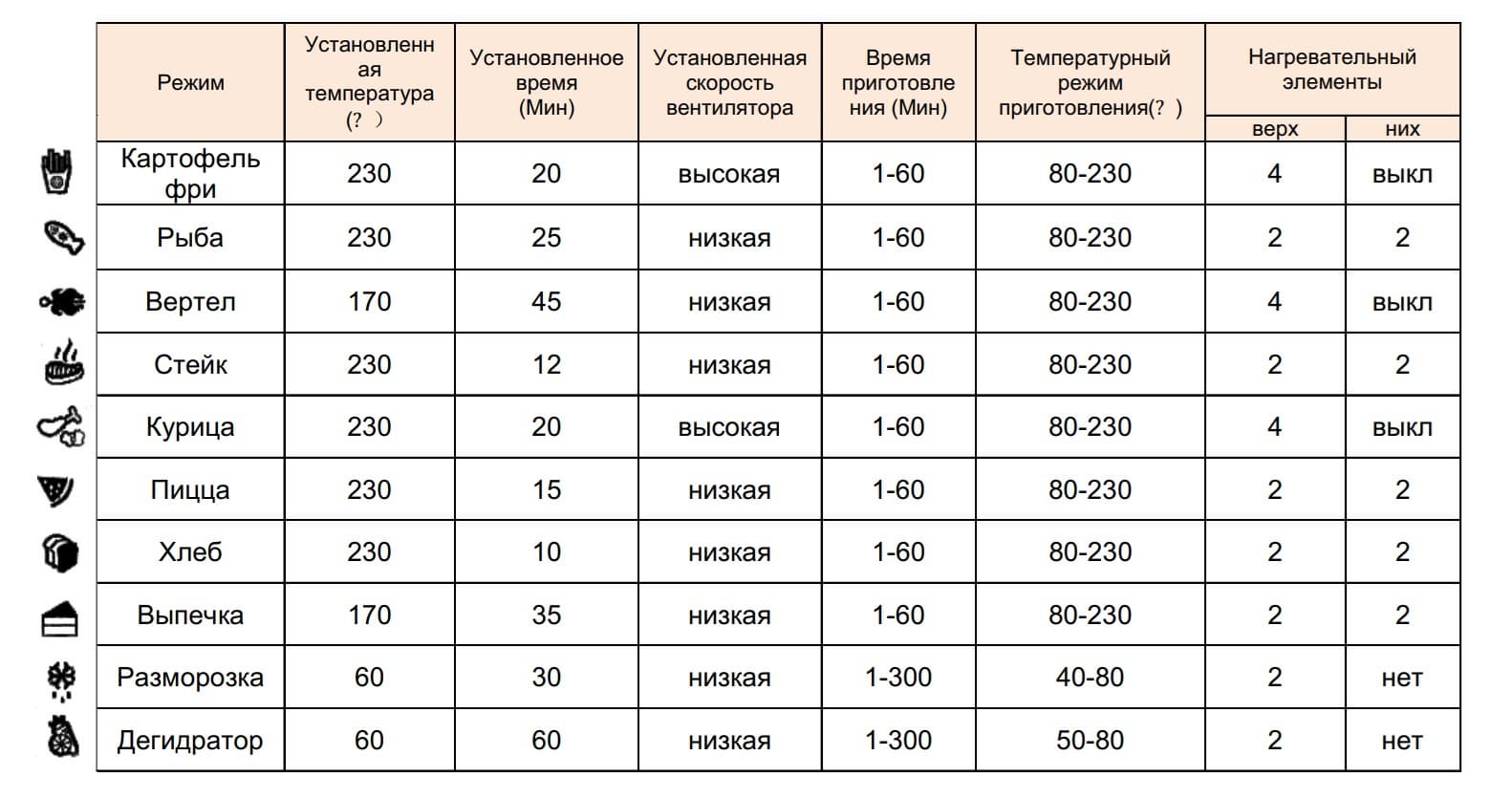 | Особенности | конвекция, гриль, вертел, камень для пиццы, шашлычница |