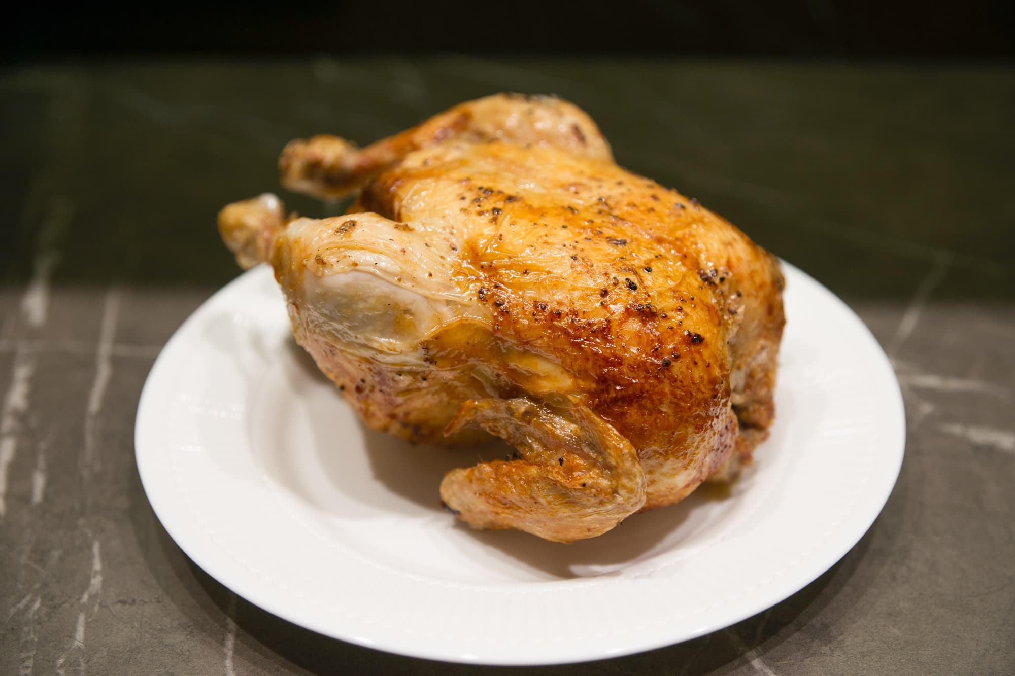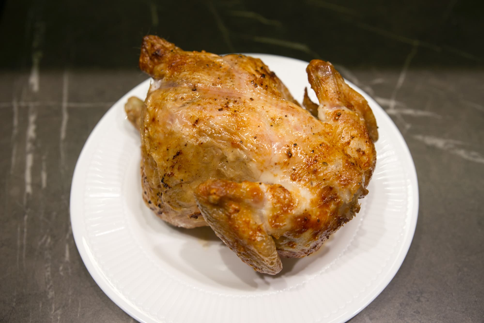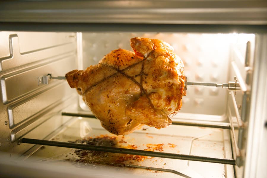 Раз в комплекте есть вертел — быть курице-гриль. Для этого теста мы взяли птицу весом 1,6 кг, натерли ее солью и специями, завязали ноги, прикололи крылья зубочистками и закрепили тушку на вертеле. За 15 минут прогрели печь, затем аккуратно установили вертел в камеру при помощи металлического держателя. Предустановленные параметры в авторежиме для вертела выглядят так: 45 минут при 230 °C. Во избежание пригораний снизили нагрев до 200 °C и запустили программу.