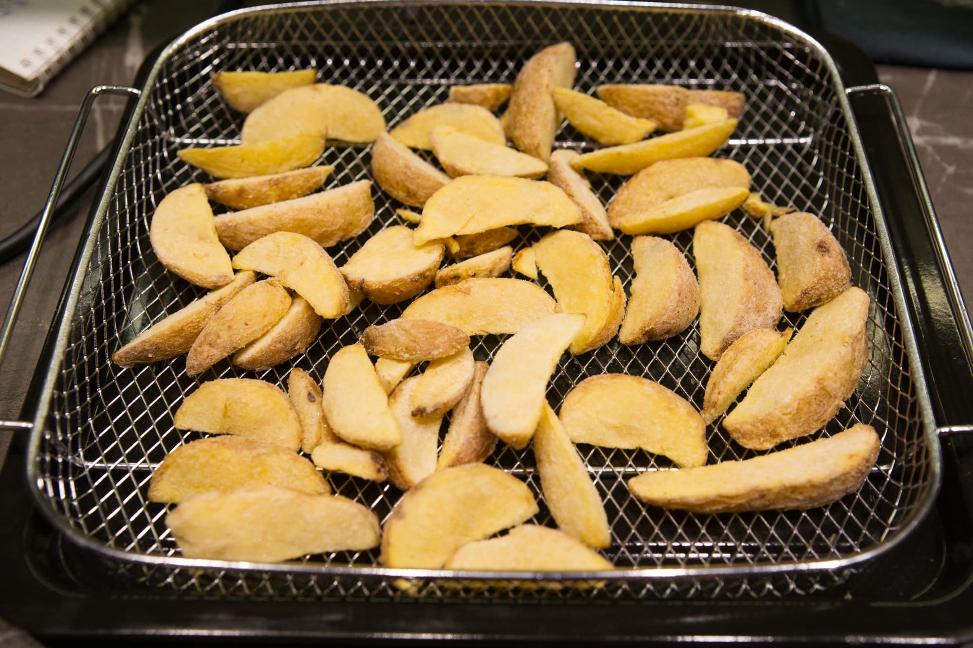 Во-первых, мы выяснили вместительность корзины для фритюра. Несмотря на невысокие бортики (чуть меньше 3 см) в нее помещается до 700 г картофеля-фри соломкой. В этом тесте мы обжаривали 400 г замороженного картофеля дольками.